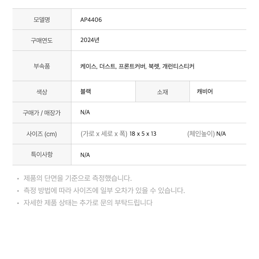 모든 상품(가죽, 의류, 잡화, 슈즈 등)은 사용자의 사용방법과 환경에 따라 변형, 변색이 될 수 있으니 반드시 취급 라벨에 표시된 관리 안내를 따르시길 권장 드립니다. 이는 정도의 차이가 있으며 과도한 체열과 땀, 습기, 빛, 마찰은 제품의 손상 및 변형을 일으킬 수 있으므로 주의하시길 바랍니다.