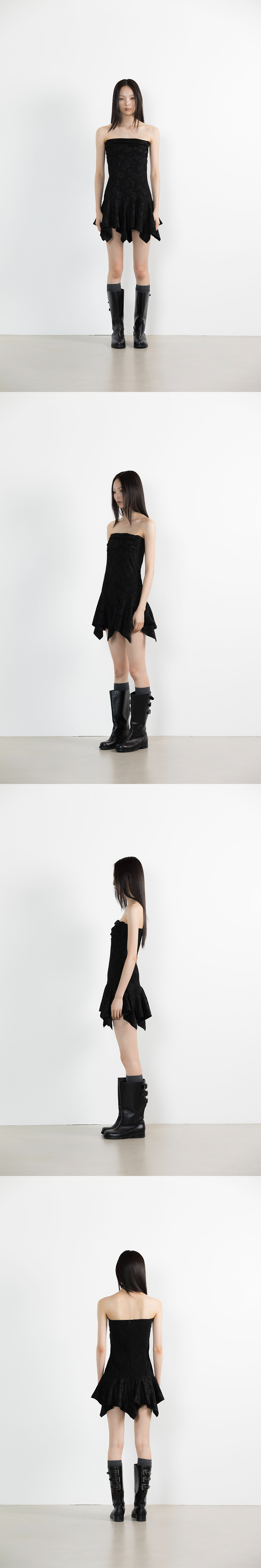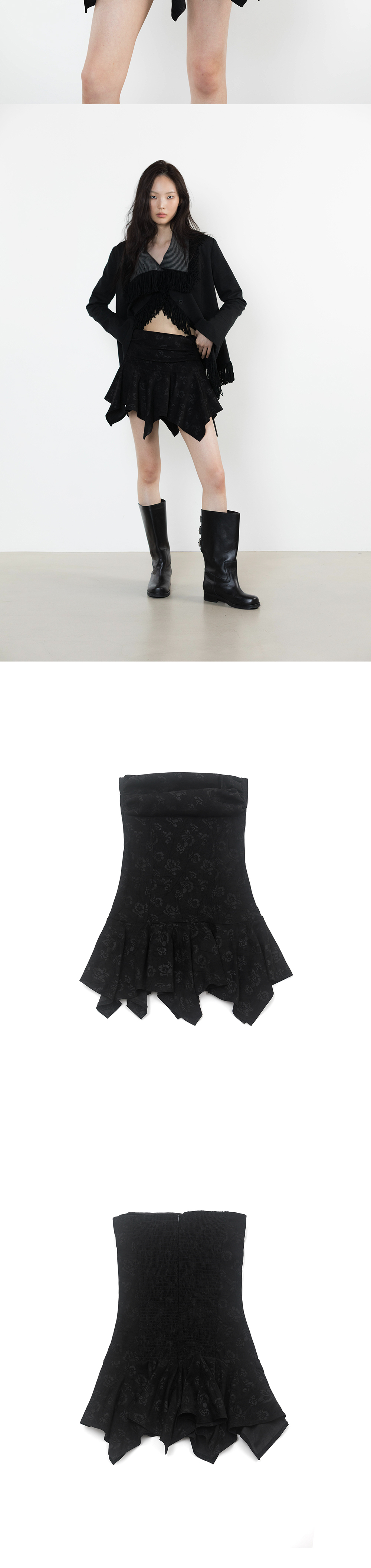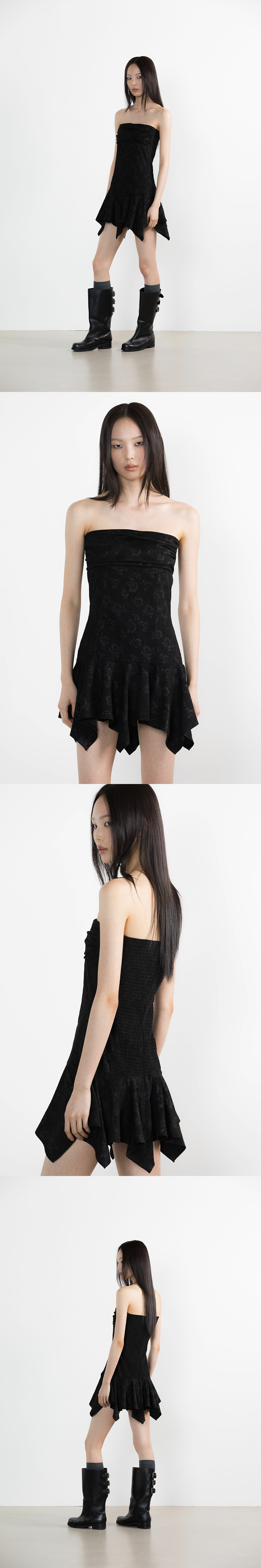 POLYESTER 97% SPANDEX 3% 총장 60-74cm, 가슴 34.5cm, 엉덩이 43cm * 상세 사이즈는 단면 기준이며, 측정 방법과 위치에 따라 1~3cm 오차 범위가 생길 수 있습니다. * 모델(176cm) 피팅 사이즈 / 원사이즈 플라워 패턴 자카드 드레스 플레어 헴 라인 백 스모킹 디테일 백 지퍼 클로징 피티드 핏