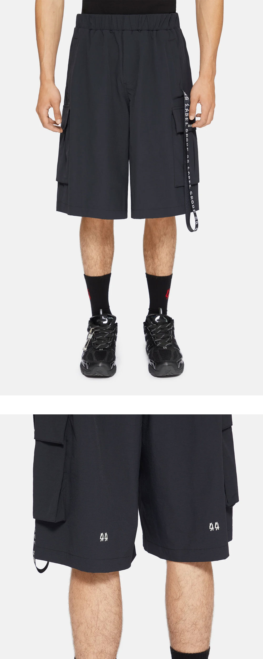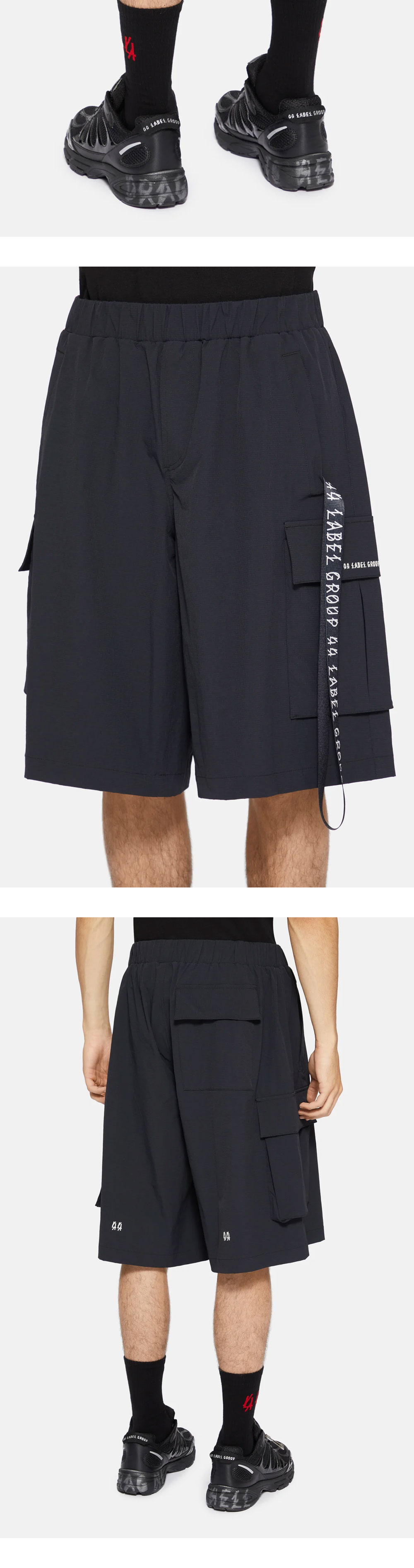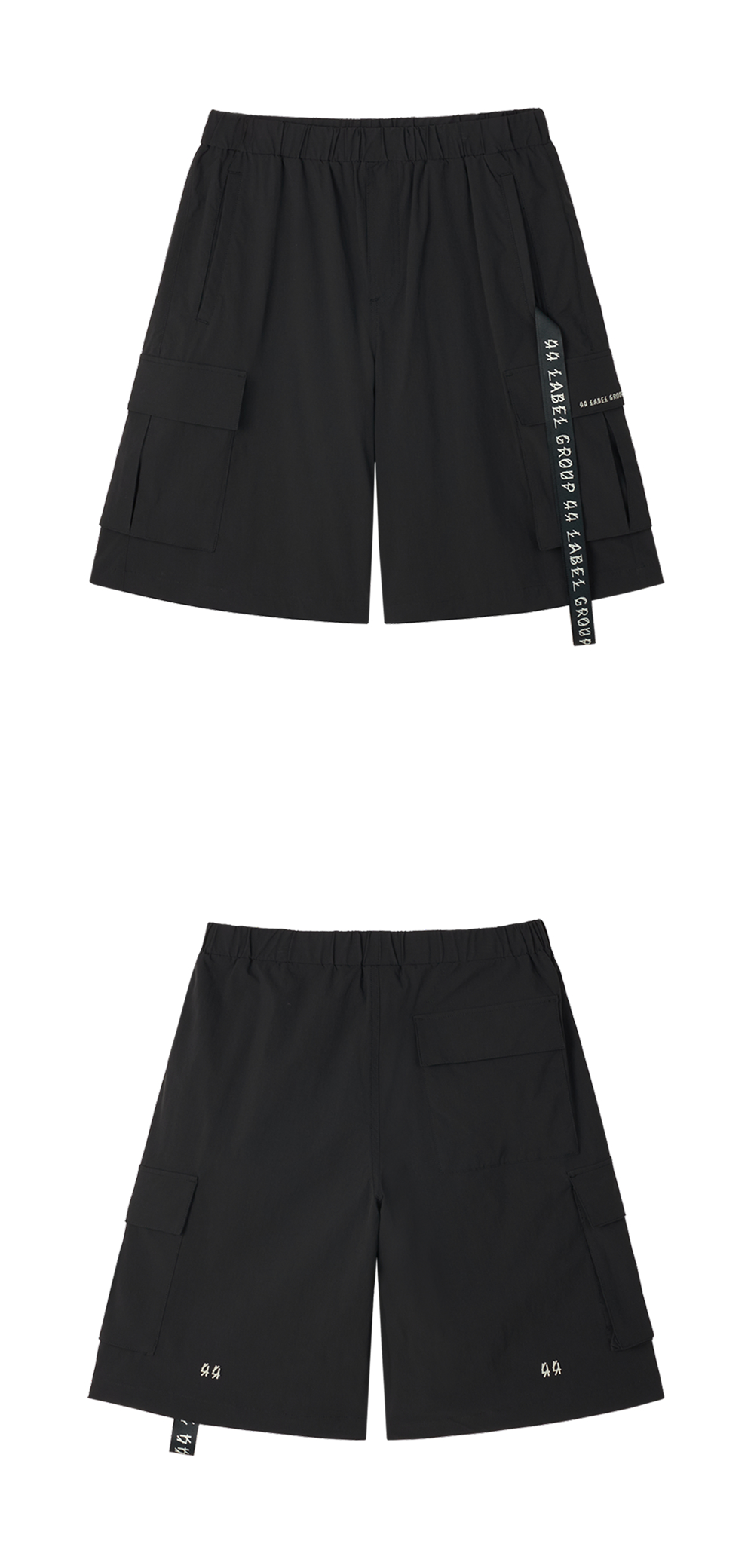 적당한 기장감의 나일론 소재로 여름철 활용하기 좋은 44 레이블 그룹의 카고 드로우스트링 나일론 립스탑 블랙입니다. - 유니섹스 디자인 - 사이드 포켓 - 포켓 및 밑단 쪽 로고 디테일