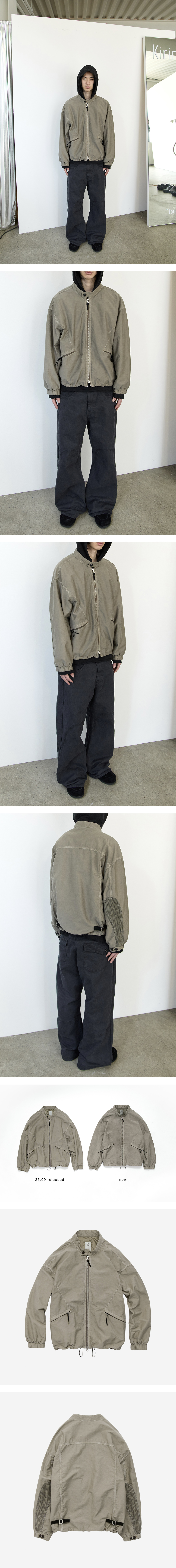 motorcycle blouson - beige - 모터사이클 자켓 기반으로 재해석된 블루종 - 엘보 가드에서 모티브를 얻은, 독특한 텍스타일의 재패니즈 패브릭 뒷소매 패치 - 가볍고 부드러운 착용감 - 센터프론트와 포켓의 지퍼 테이프 배색 및 샤무드 풀러 - 샤무드로 제작된 사이드 어드저스터 - YKK 투웨이 지퍼 클로징 - 지갑 등 수납에 용이한 내부 포켓 - 밑단 스트링으로 실루엣 조절 가능 *모델: 178cm / 마른 체형, 3사이즈 착용 *직전 차수 대비, 채도가 낮게 완성되었으며, 유사한 피팅감으로 제작되었습니다.