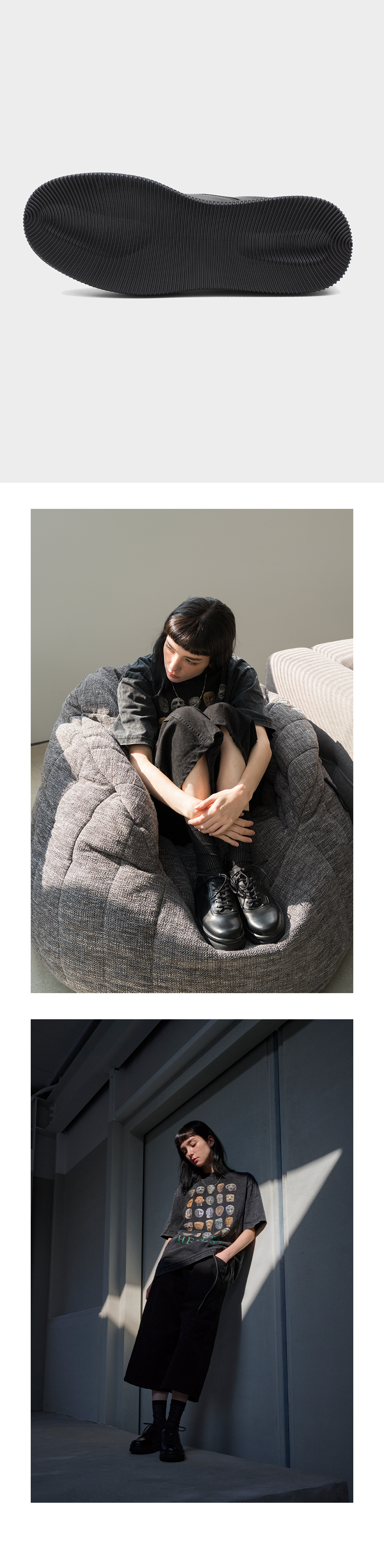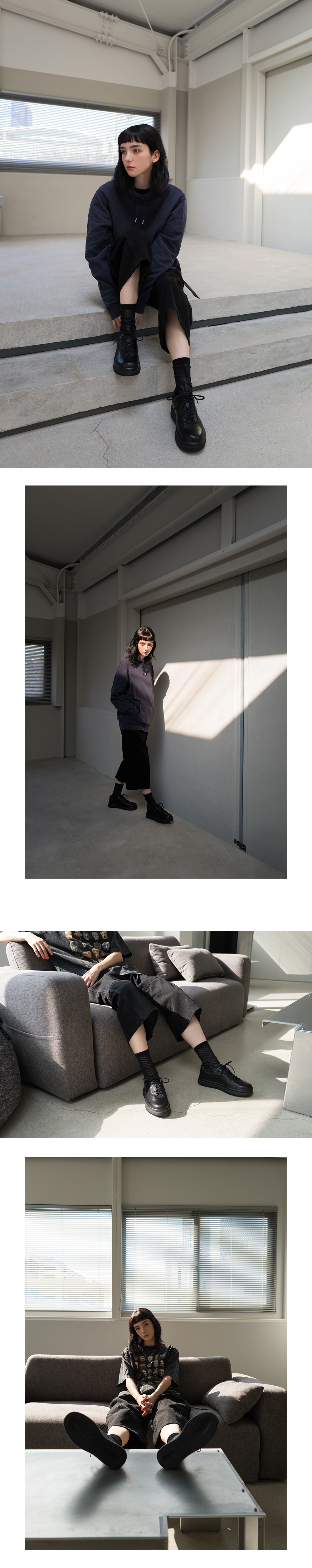 upper : cow leather, nylon linning : pig leather , mesh sole : rubber, tpu heel : 4cm + caution 뒷축을 꺽어 신는 착용은 피해주세요 + detail 구두와 스니커즈의 미스매치 전체적으로 은은한 광을 가진 소가죽으로 구두같은 질감을 표현 구두의 vamp패턴을 살려내고 스니커즈에서 사용하는 아일렛 패턴과 작은 디테일들을 추가하고 나일론으로 마무리하여 스니커즈처럼 통기성을 고려했습니다. 4cm라는 굽높이를 가지고 있지만 경량화시켜 가볍고 편한 착화감을 가지고있으며 소재도 두가지로 나눠 경계를 넘나드는 느낌을 냈습니다. + size 구두사이즈로 넉넉하게 제작되었습니다 발등발볼의 넓거나 양발 길이 차이가 있으시다면 정사이즈를 추천드립니다 (275~280)의 경우 275사이즈(구두사이즈)로 스니커즈 280신으시는분도 신을수있습니다 + bonus 스니커즈끈 +스토퍼,구두끈 총 2가지끈