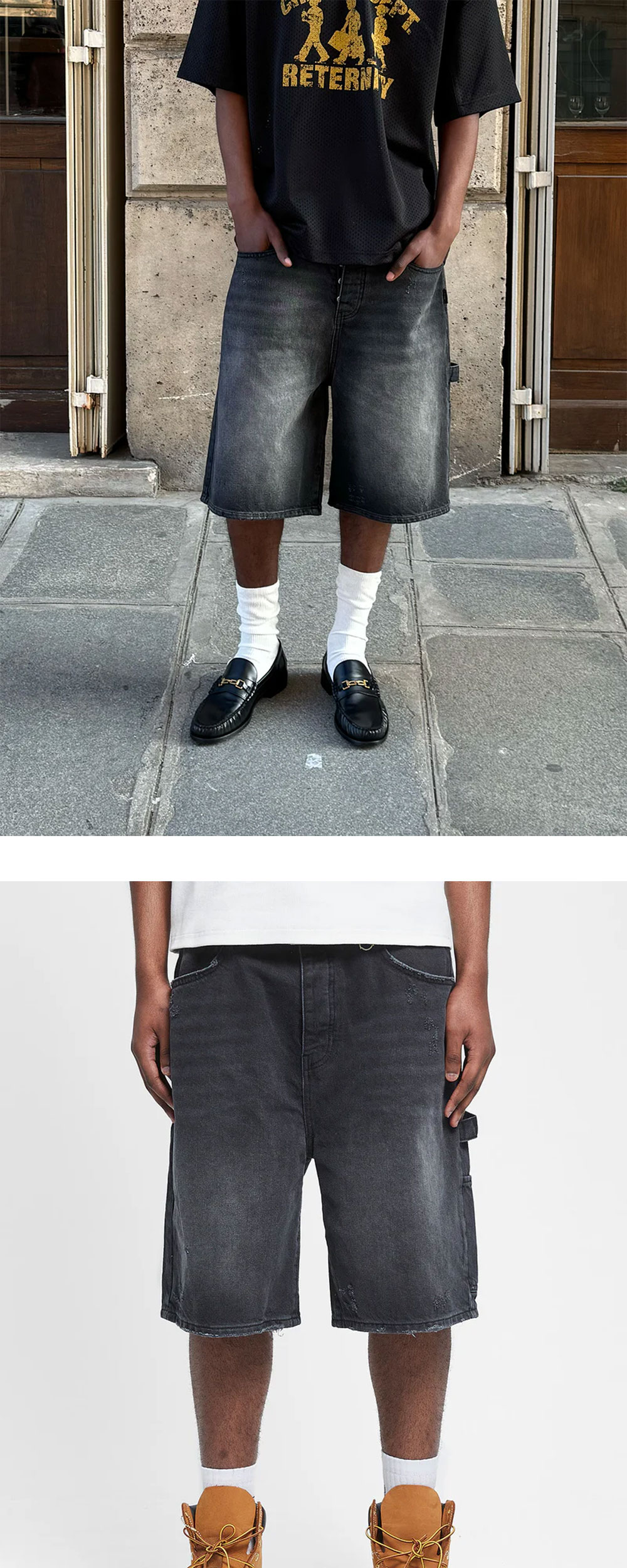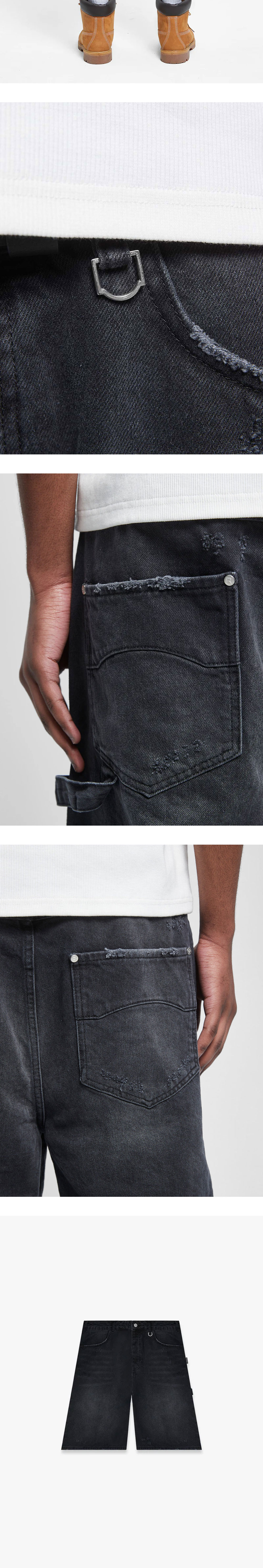 짙은 컬러의 워싱이 인상적인 리터니티의 사인 조츠 워시드 블랙입니다. - 100% 면 - baggy loose fit - 수작업으로 만들어진 디스트로이드 디테일 - 진한 워싱 블랙 데님