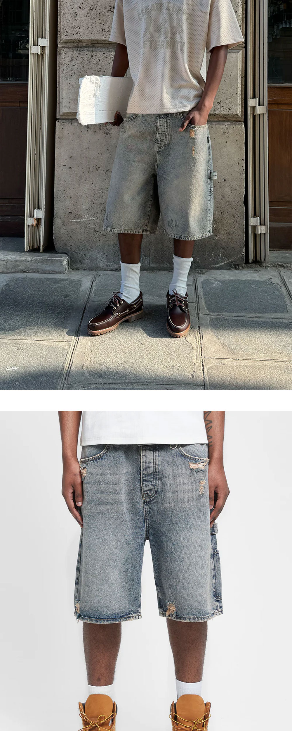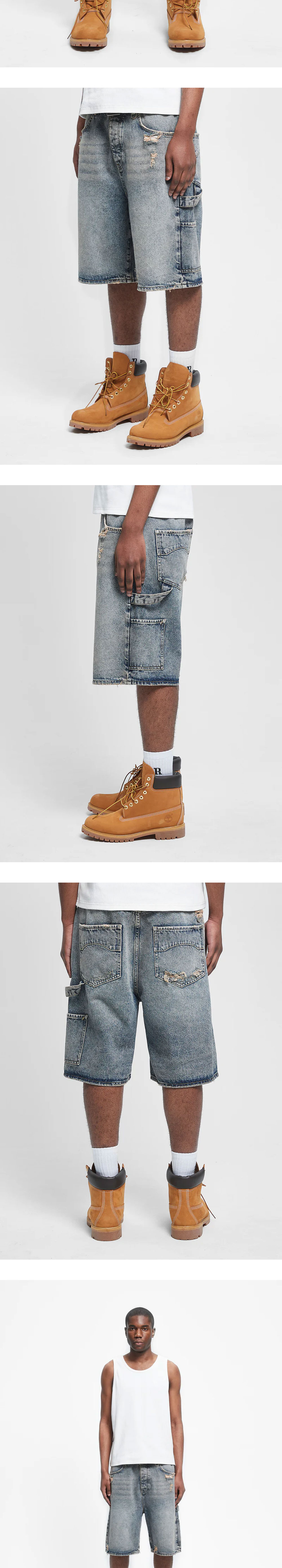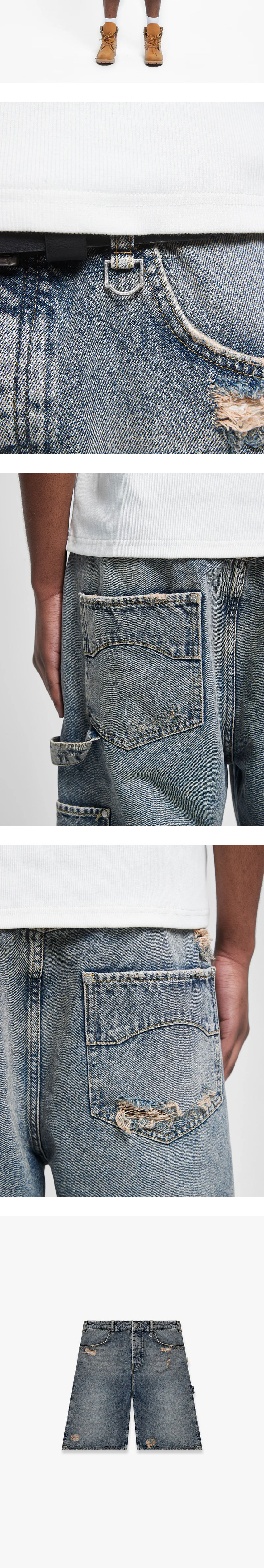 짙은 컬러의 워싱이 인상적인 리터니티의 사인 조츠 워시드 블루입니다. - 100% 면 - baggy loose fit - 수작업으로 만들어진 디스트로이드 디테일 - 진한 워싱 블루 데님