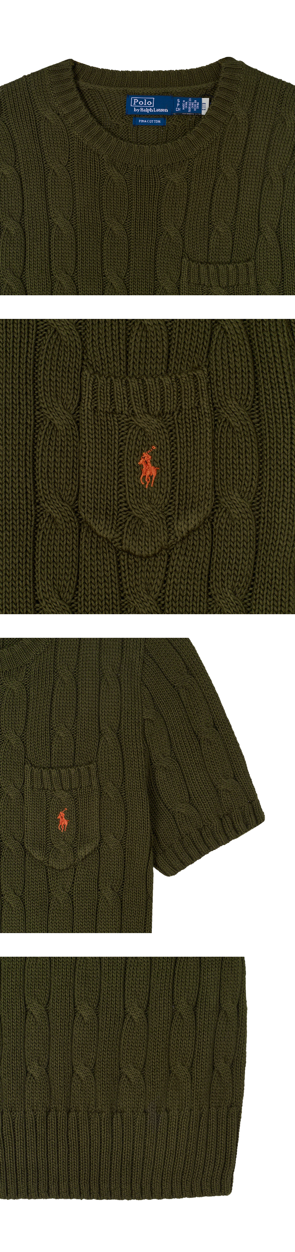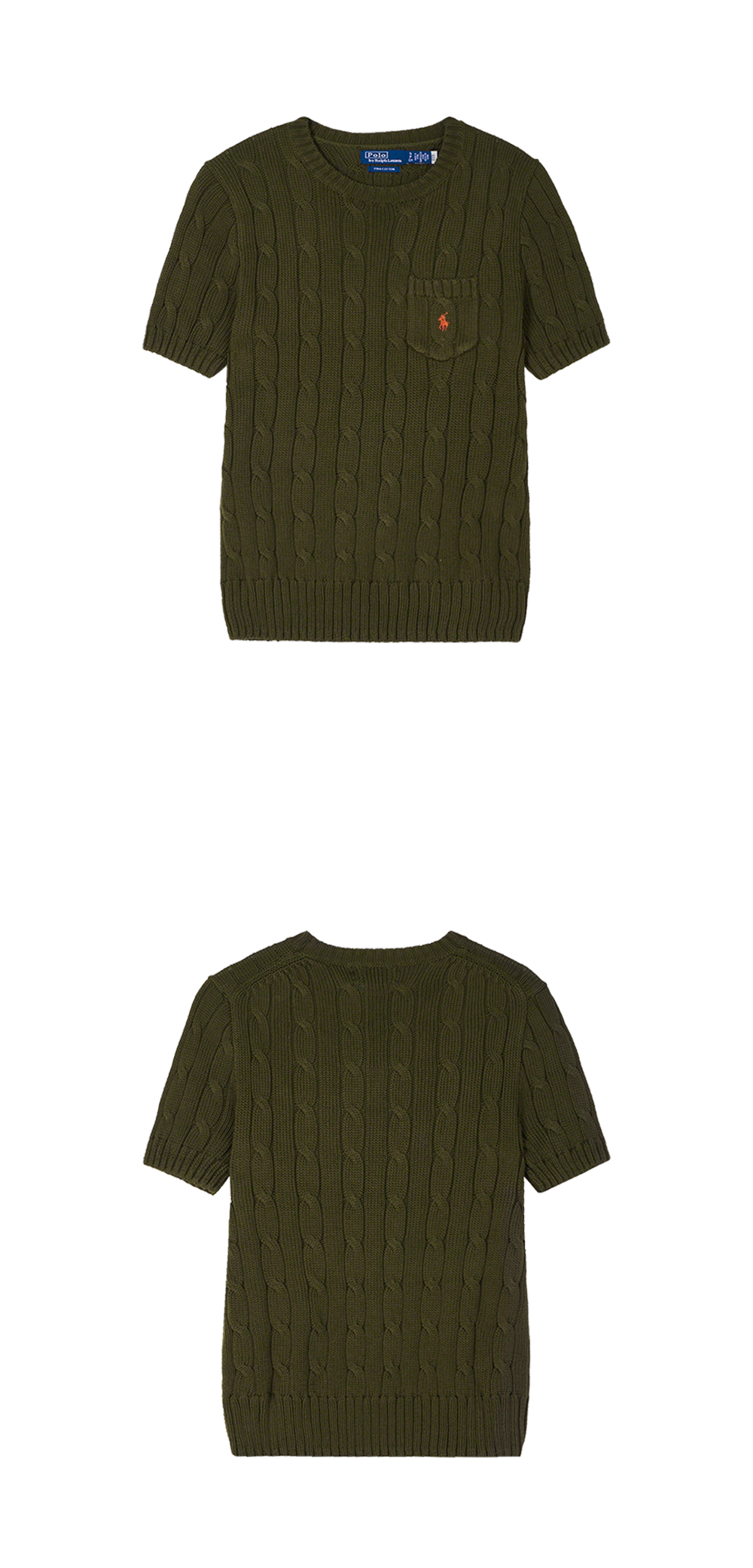 < KREAM은 랄프로렌 코리아 공식 파트너사로 모든 상품은 랄프로렌 코리아(유)에서 공급받은 정식 수입 제품입니다 > 컬러가 매력적인 폴로 랄프 로렌 우먼 케이블 니트 코튼 쇼트 슬리브 스웨터 그린입니다. - 슬림핏 - 왼쪽 가슴에 패치 포켓 - 시그니처 포니 자수