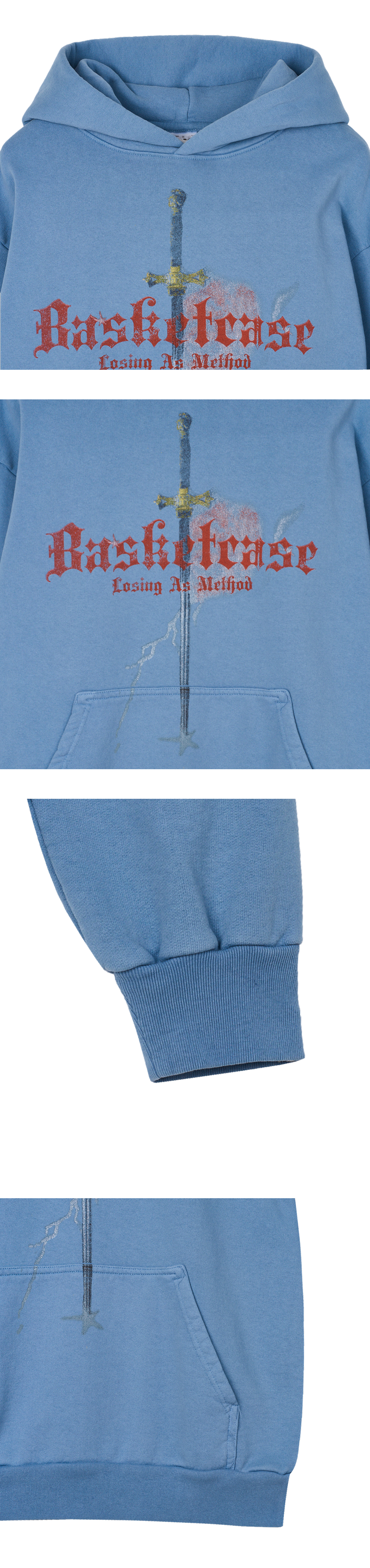 유니크한 프린팅이 눈길을 끄는 바스켓케이스의 러쉬 후디 페이디드 블루입니다. - 전면의 검에 찔린 듯한 그래픽 디자인 - 붉은색 브랜드 로고 및 "losing as method" 프린팅 - 빈티지한 색감