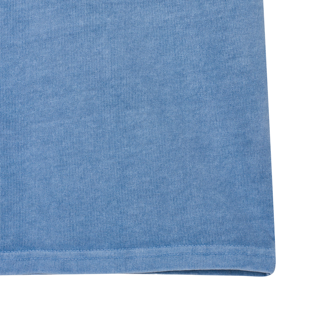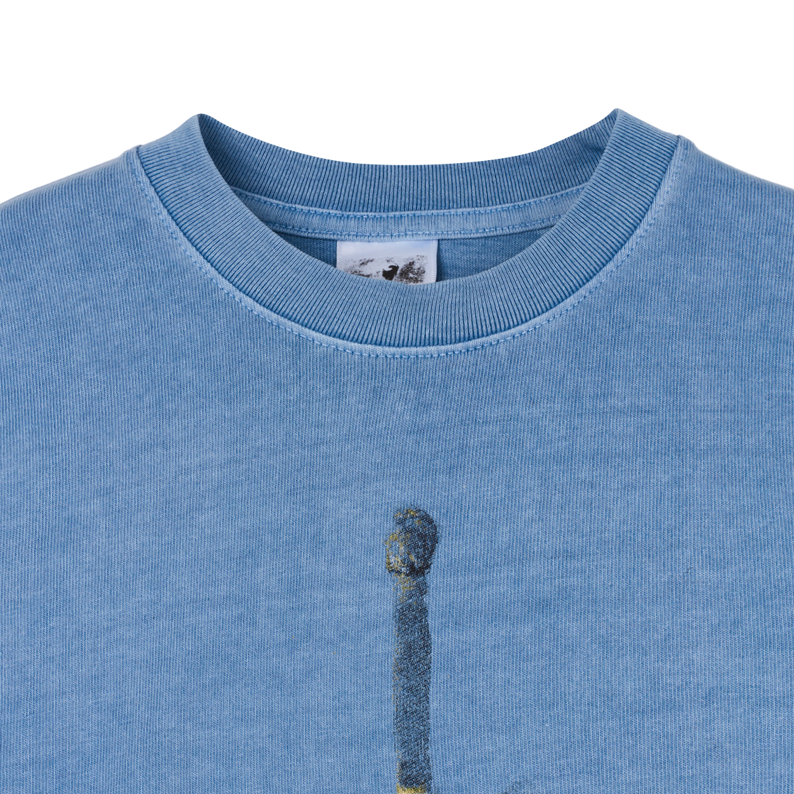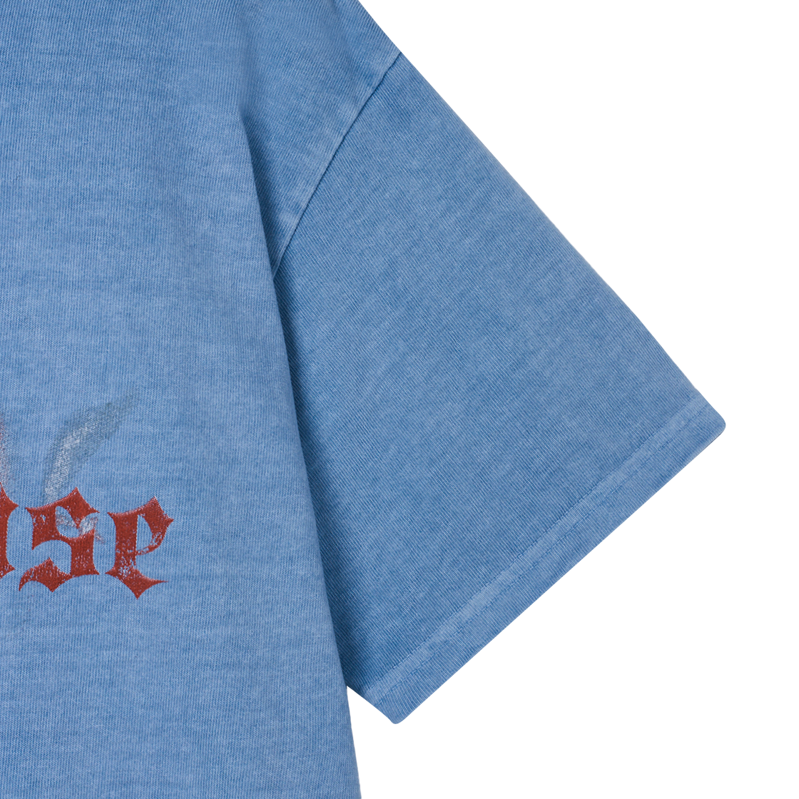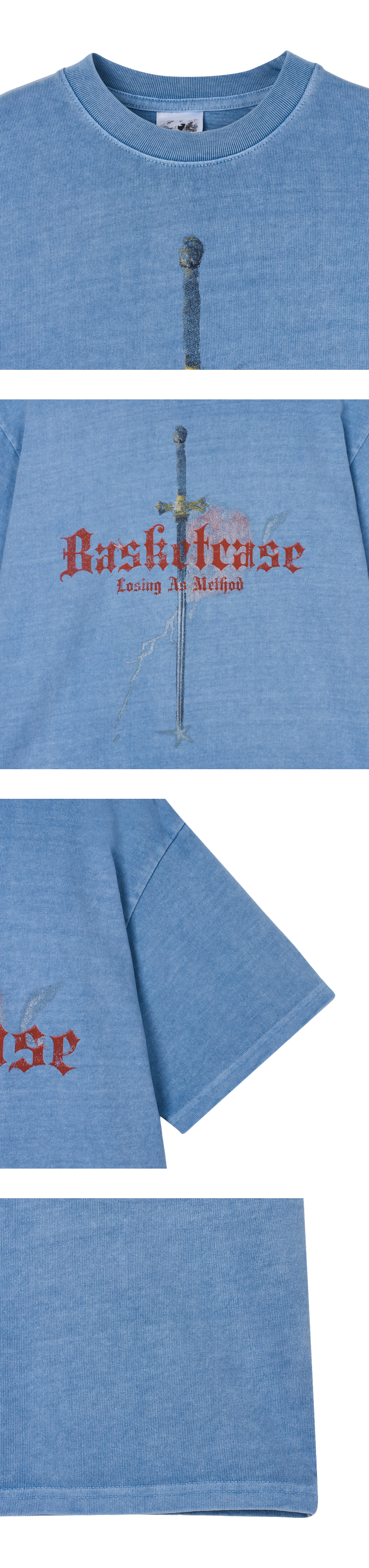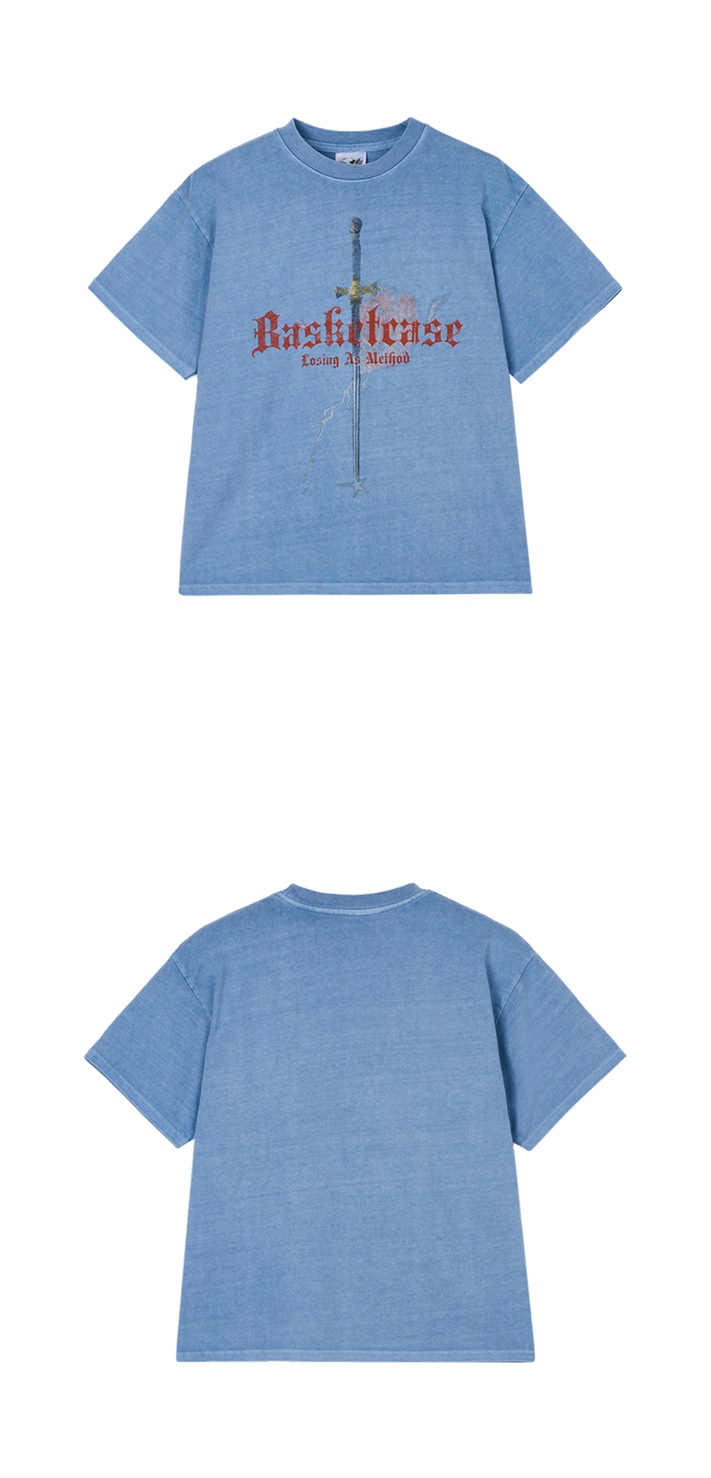 내구성이 강한 바스켓케이스 러쉬 티셔츠 블루 - 25SS입니다. - 박스형 오버핏 실루엣 - 빈티지 워싱 - 검과 번개 모티브의 실크스크린 인쇄 *빈티지 워싱으로 인한 얼룩은 불량이 아닌 의도된 디자인입니다.