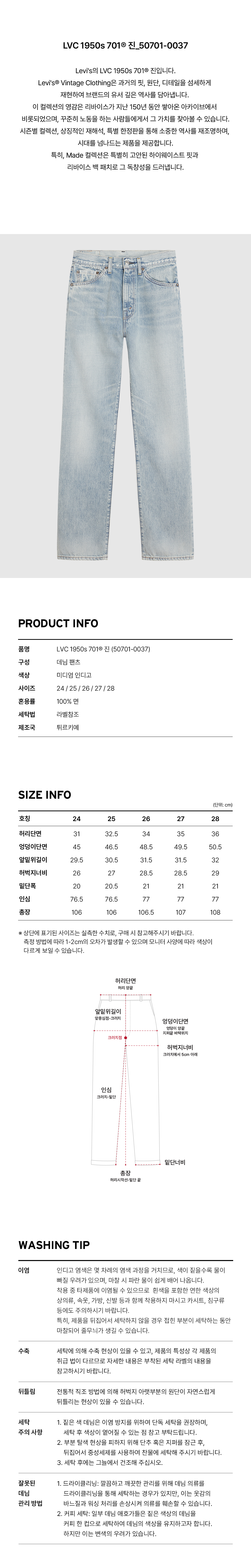 리바이스 LVC 우먼 1950 701 진 라이트 인디고
