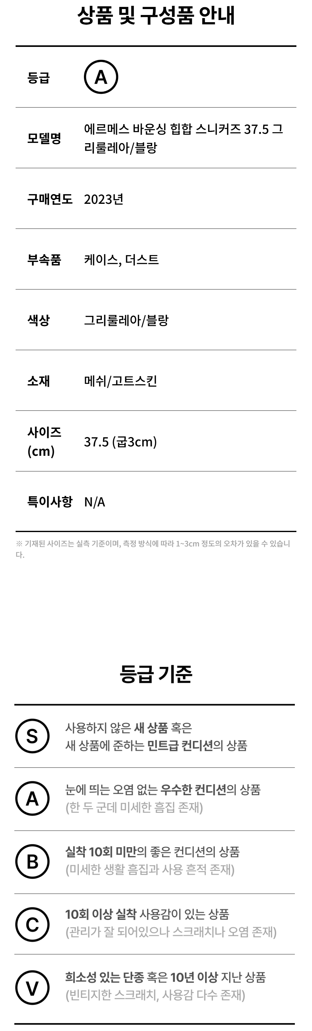 에르메스 바운싱 힙합 스니커즈 37.5 그리룰레아/블랑