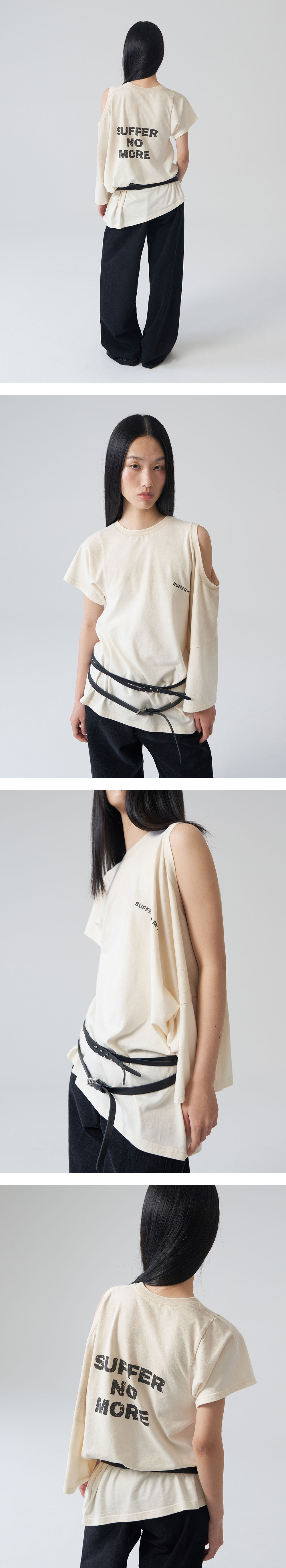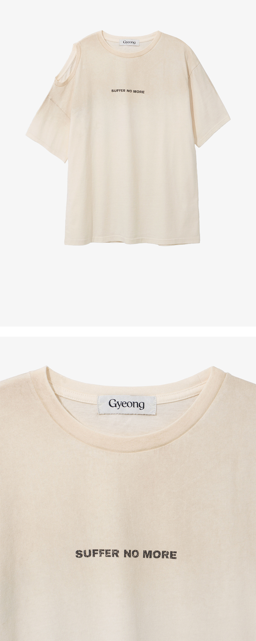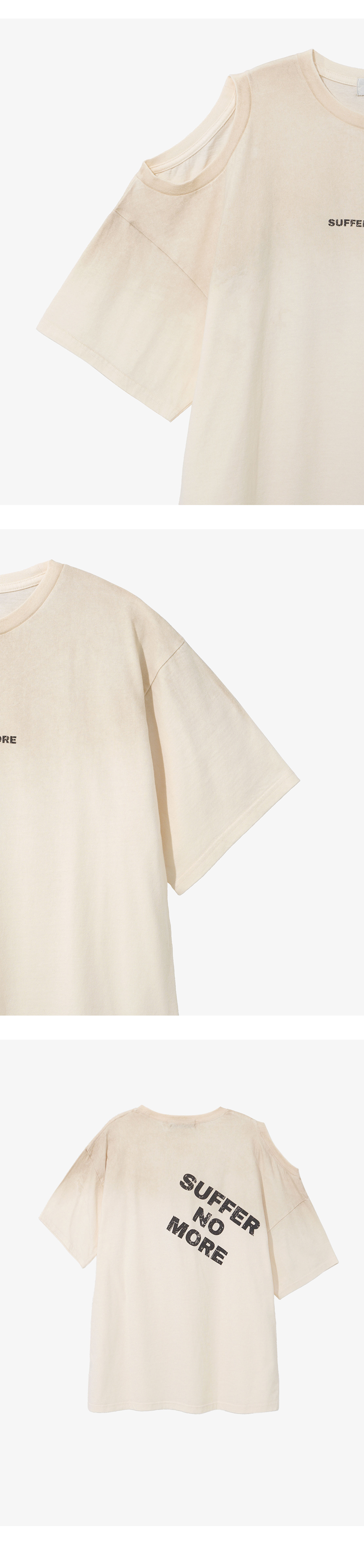 - 언밸런스 형태의 원 오픈 숄더 그래픽 탑 - 원 오픈 숄더 디테일으로 다양한 스타일링 연출 용이 - 전면 Suffer No More 빈티지 타이포 그래픽 - 후면 Suffer No More 빈티지 타이포 그래픽 - 상단 더티 워싱 - 어깨라인 체인스티치 보강 - 부드러운 원단의 터치감 - 편안한 착용감의 레귤러핏의 실루엣 * Shell : 100% Cotton * Made in Korea