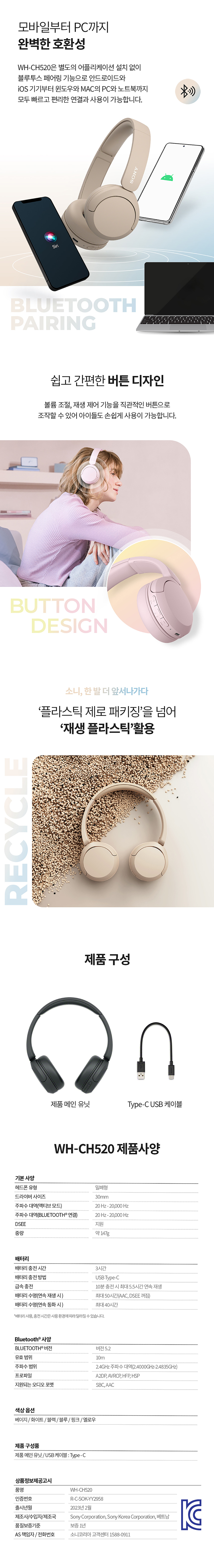 소니 WH-CH520 옐로우 (소니 코리아 정식 발매 제품)