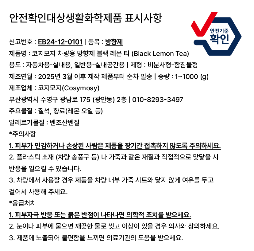 플라스틱 소재 (차량 송풍구 등) 나 가죽과 같은 재질과 직접적으로 맞닿을 시 반응을 일으킬 수 있습니다.