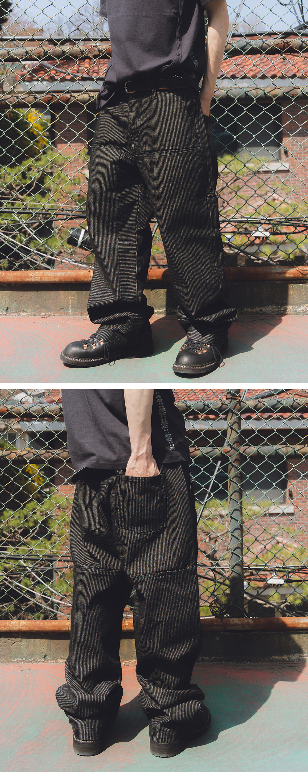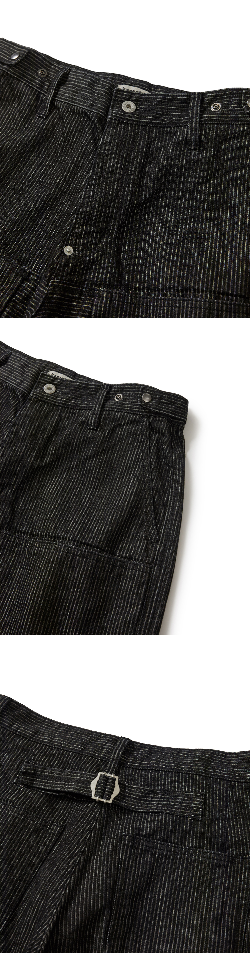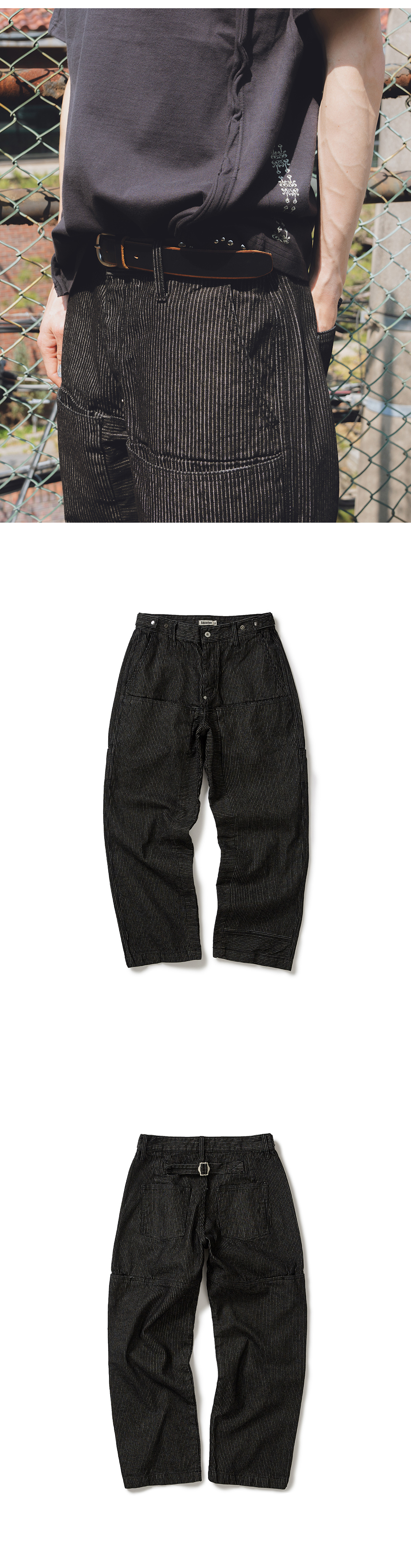 Product Info. - 탄탄한 밀도와 적당한 고시감의 스트라이프 데님 원단 - 레귤러 한 실루엣의 테이퍼드 핏 데님 팬츠 - 워싱 가공으로 자연스러운 퍼커링 - 전/후면 레그 상단 절개 및 히든 포켓 디테일 - 안쪽 레그 라인과 좌측 밑단 부 결방향을 활용한 패널 디자인 - 후면 상단 다트 요크 디테일 - 후면 스트랩 어드저스터 디테일 - 허리 사이즈 조절 가능한 벨트라인 양 사이드 버튼 어드저스터 - ykk 택버튼, ykk 리벳 디테일