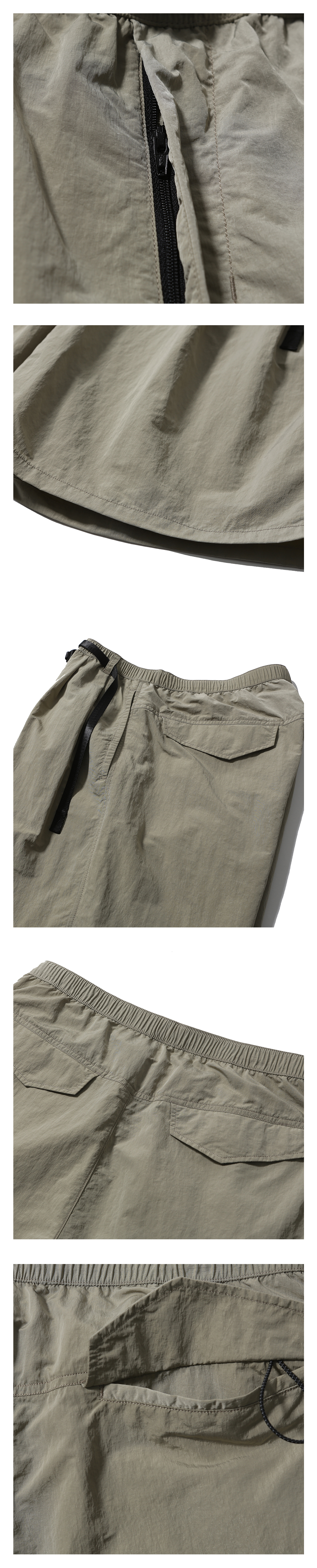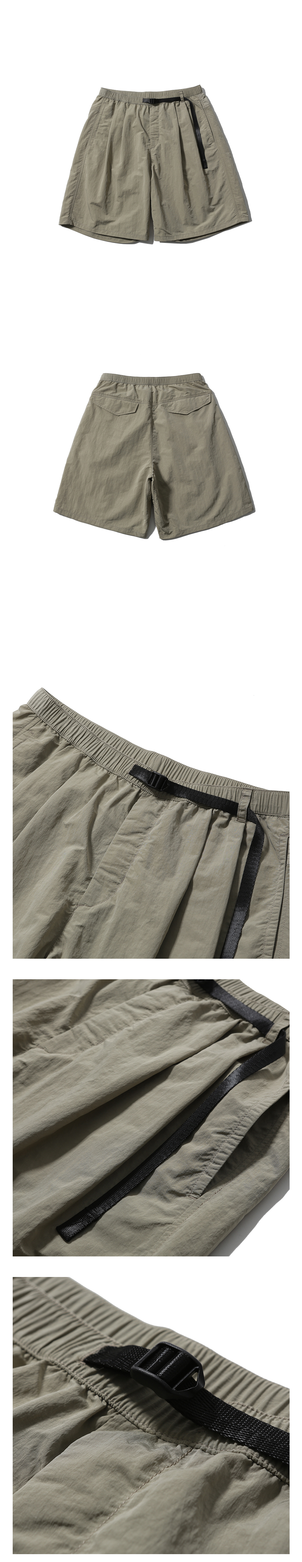 캐주얼한 느낌의 편안한 반바지 · 여유 있는 오버사이즈 실루엣. · 메탈릭 한 표면감의 크링클 나일론 원단 사용. · 재귀반사 스트링 고리가 달린 덮개가 있는 뒷주머니 사양. · 허리에 턱을 넣어 편안한 착용감과 풍성한 실루엣 연출. · 가랑이 부분에 거셋을 넣어 활동성 확보. · 뒤판 내부 상단은 메시를 덧대어 쾌적한 착용감을 제공. · 사이즈 조절이 가능한 허리 벨트와 신축성이 있는 허리 밴드.