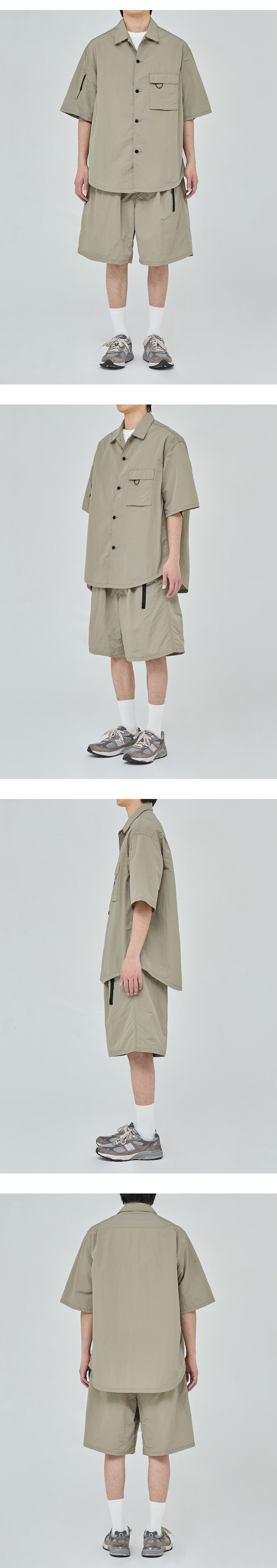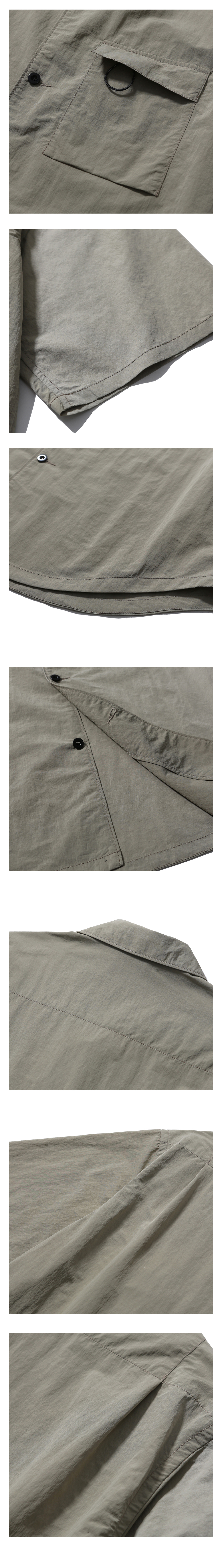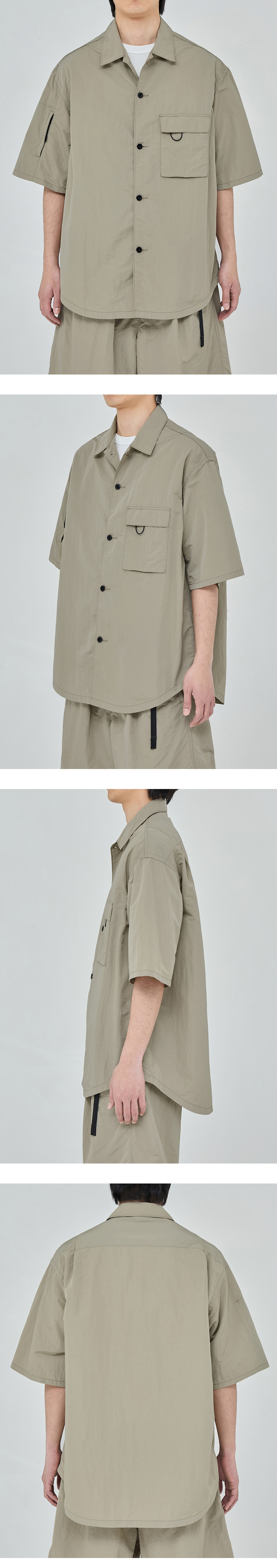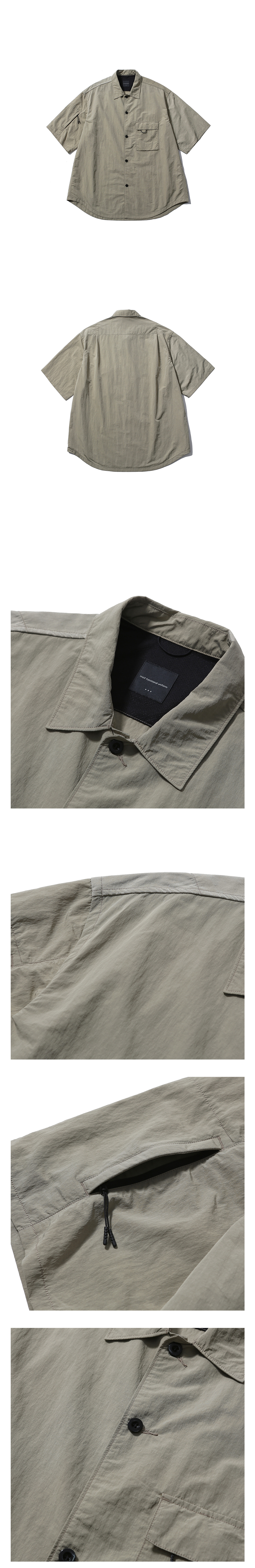 캐주얼한 느낌의 편안한 반팔 셔츠 · 여유 있는 오버사이즈 실루엣. · 메탈릭 한 표면감의 크링클 나일론 원단 사용. · 단추로 구성된 앞여밈 사양. · 재귀반사 스트링 고리가 달린 덮개가 있는 가슴 주머니 사양. · 지퍼가 달린 소매 주머니 사양. · 등판 내부 상단은 메시를 덧대어 쾌적한 착용감을 제공.