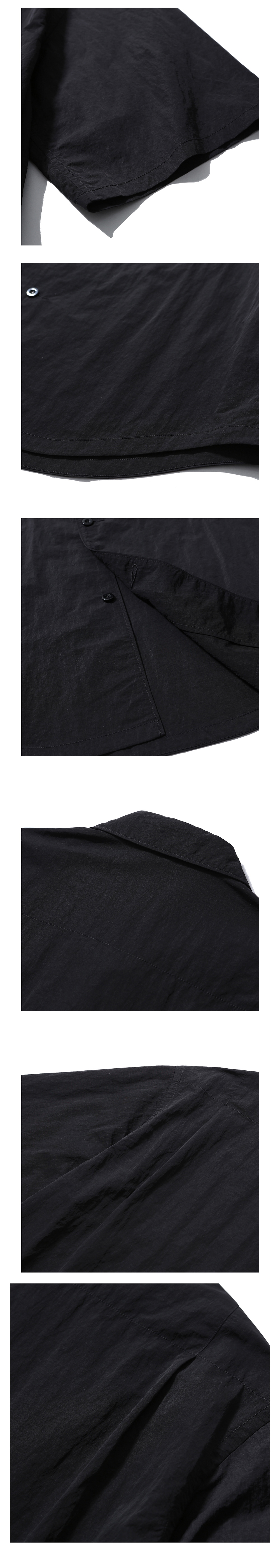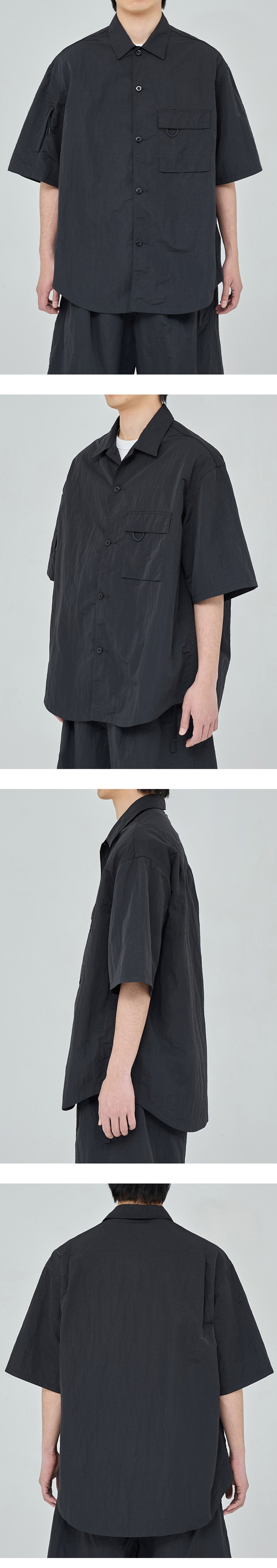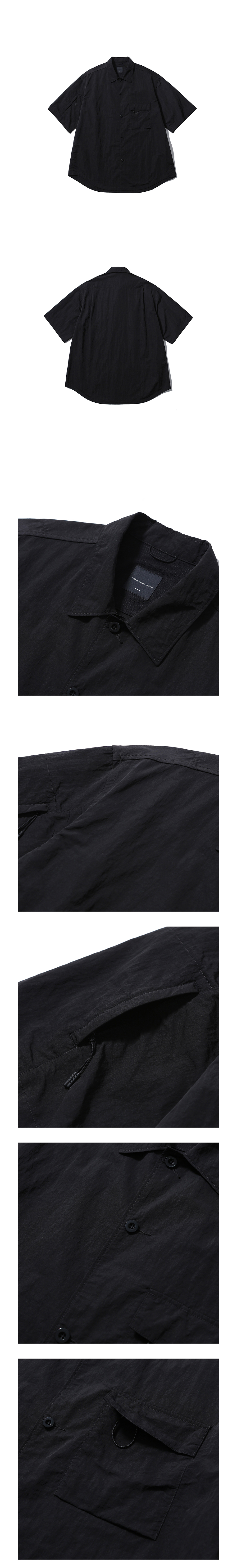 캐주얼한 느낌의 편안한 반팔 셔츠 · 여유 있는 오버사이즈 실루엣. · 메탈릭 한 표면감의 크링클 나일론 원단 사용. · 단추로 구성된 앞여밈 사양. · 재귀반사 스트링 고리가 달린 덮개가 있는 가슴 주머니 사양. · 지퍼가 달린 소매 주머니 사양. · 등판 내부 상단은 메시를 덧대어 쾌적한 착용감을 제공.