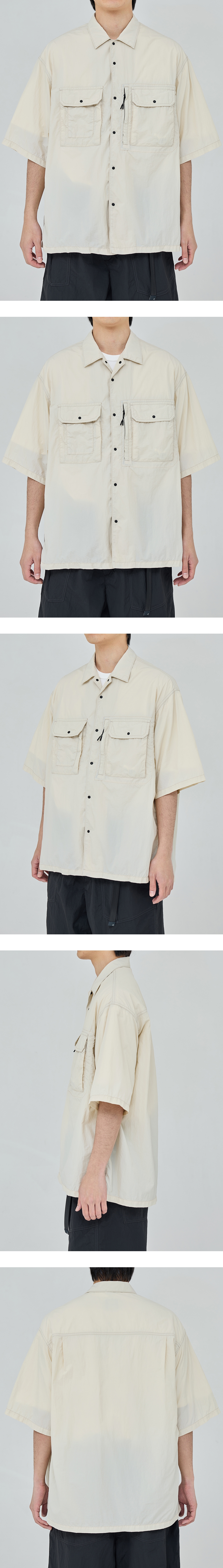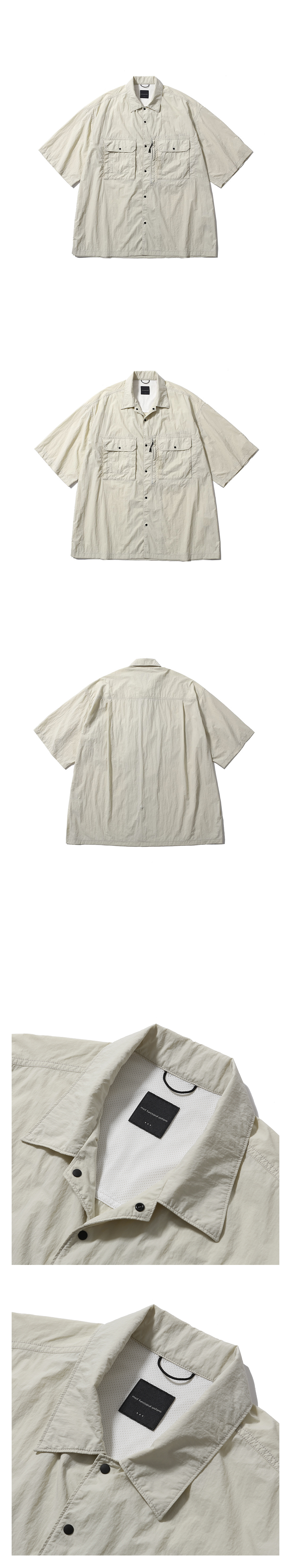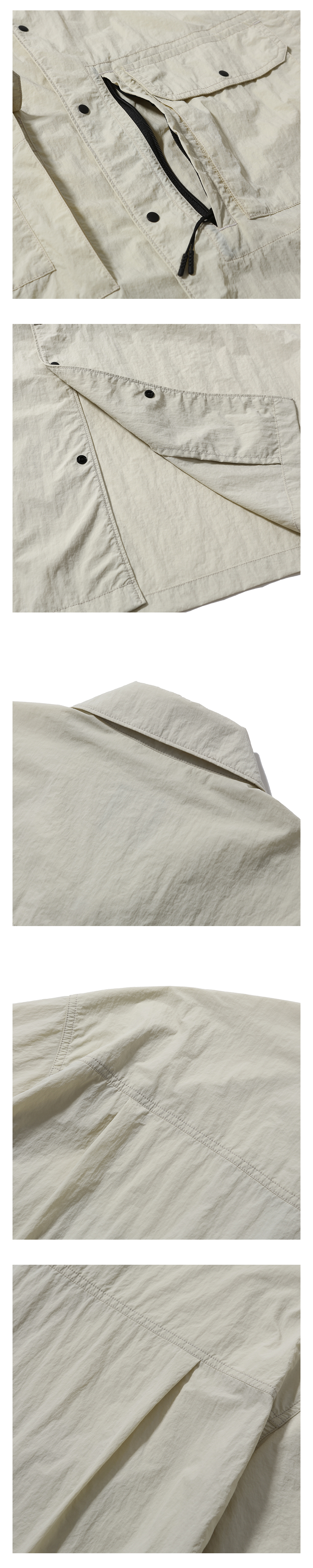 스포티한 느낌의 가벼운 오픈칼라 셔츠 · 여유 있는 오버사이즈 실루엣. · 가볍고 쾌적한 착용감의 나일론 원단 사용. · 모든 버튼이 스냅으로 되어 간편하게 착용 가능. · 스냅 여밈의 패치 포켓과 지퍼 주머니 사양. · 오픈칼라 타입으로 스포티한 느낌 연출. · 등판 내부 요크는 메시를 사용하여 통기성이 좋아 쾌적한 착용감을 제공.
