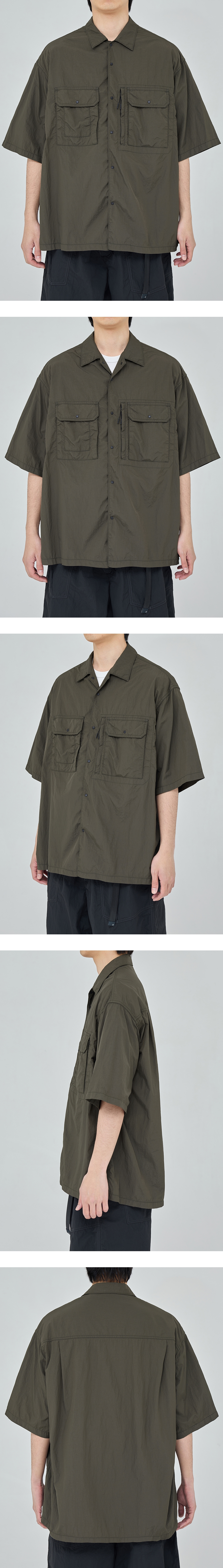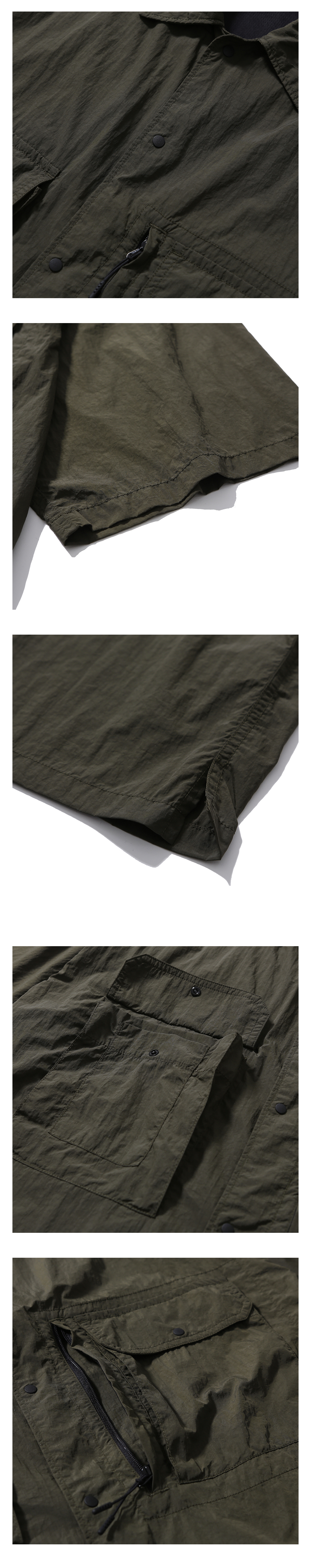 스포티한 느낌의 가벼운 오픈칼라 셔츠 · 여유 있는 오버사이즈 실루엣. · 가볍고 쾌적한 착용감의 나일론 원단 사용. · 모든 버튼이 스냅으로 되어 간편하게 착용 가능. · 스냅 여밈의 패치 포켓과 지퍼 주머니 사양. · 오픈칼라 타입으로 스포티한 느낌 연출. · 등판 내부 요크는 메시를 사용하여 통기성이 좋아 쾌적한 착용감을 제공.