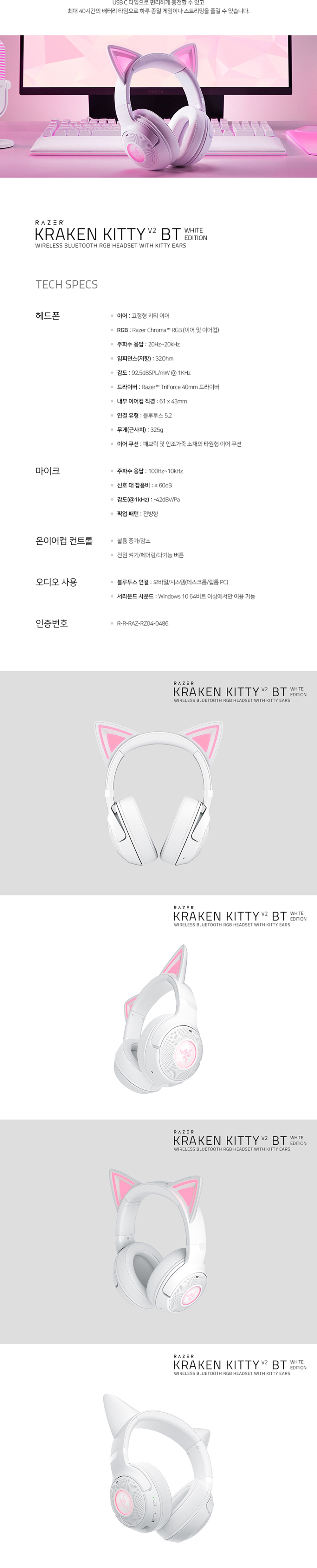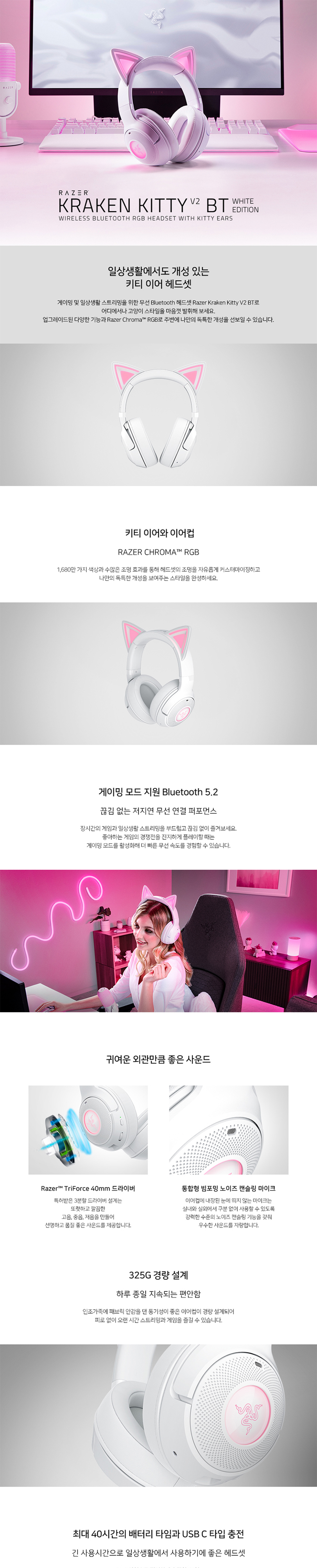 레이저 크라켄 키티 V2 BT 블루투스 게이밍 RGB 헤드셋 화이트