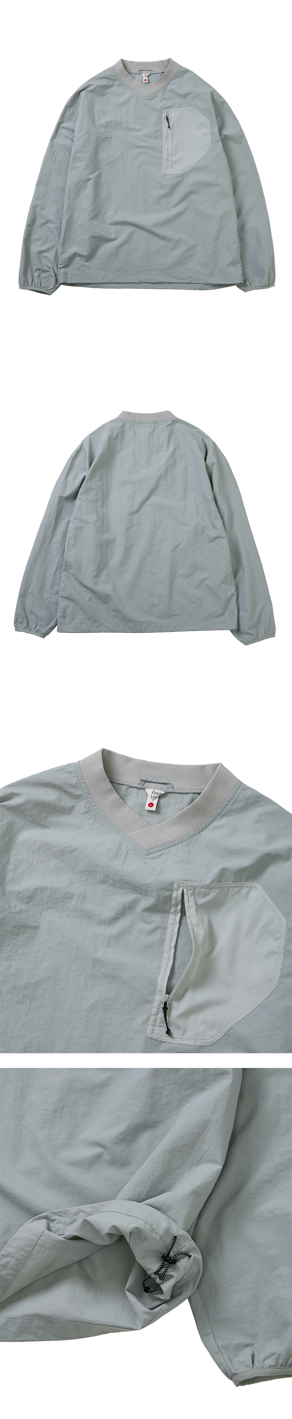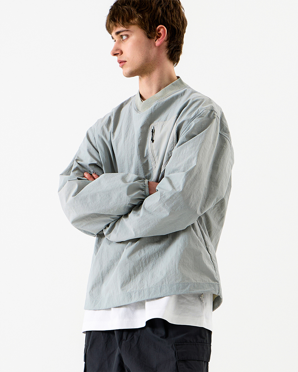 가볍고 루즈한 핏의 V넥 롱 슬리브 내구성 높은 나일론 원단으로 편안한 착용감과 뛰어난 활동성 제공 전면 가슴 부분에 실용성을 높인 세로 지퍼형 포켓 배치 탄성 있는 밴드 처리된 소맷단 밑단 스트링 디테일로 다양한 연출 가능