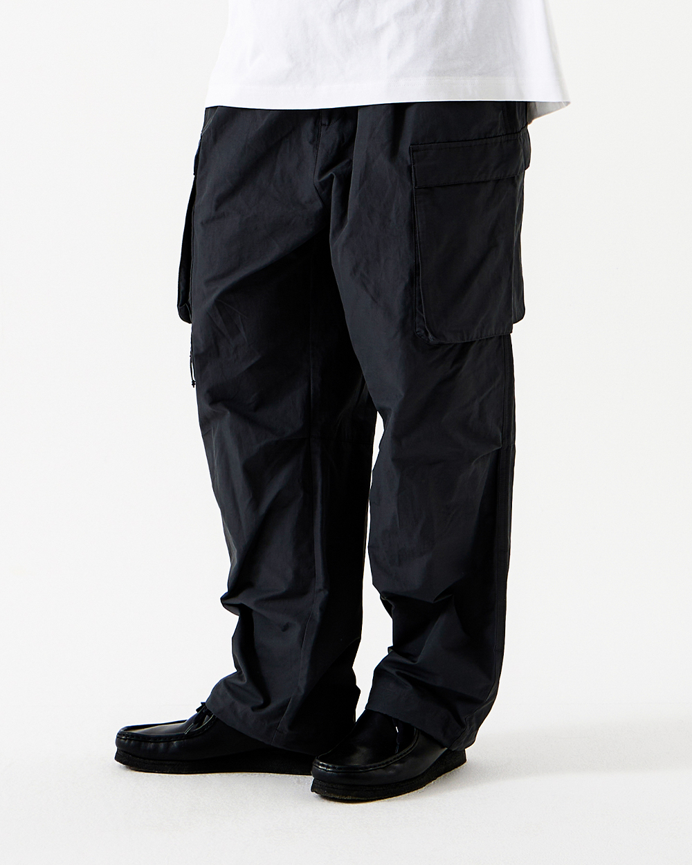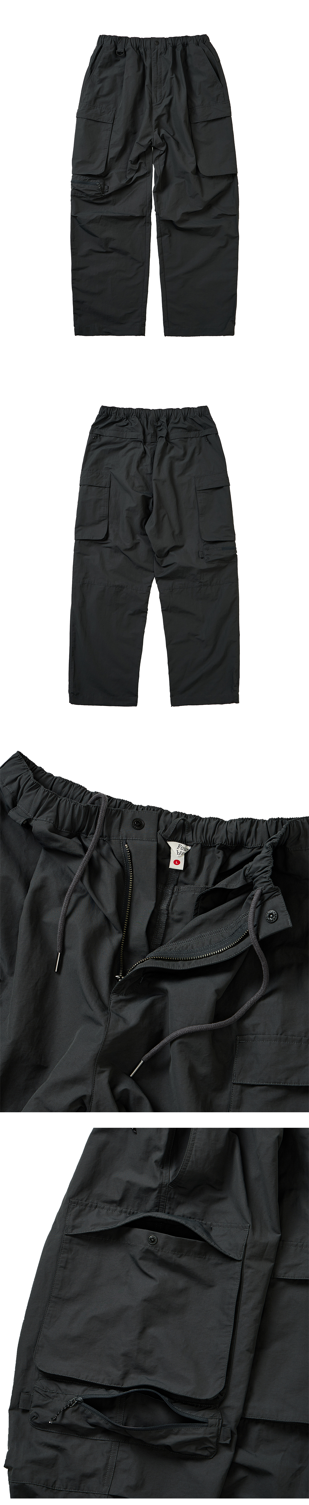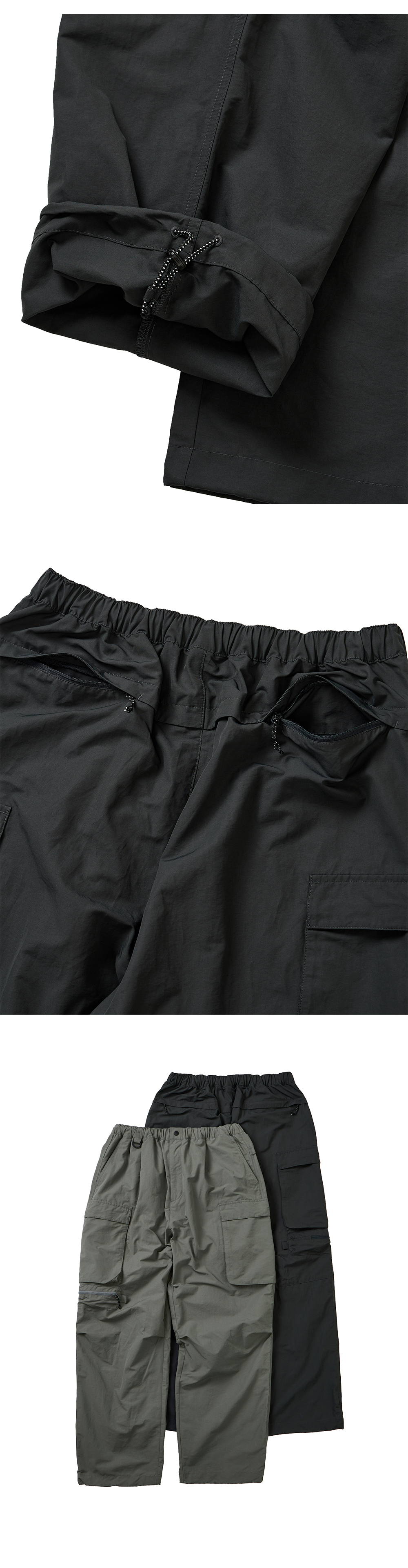 와이드 핏 실루엣과 입체적인 핀턱 디테일 양 사이드 버튼형 카고 포켓과 우측 지퍼 포켓, D링 디테일 벨트가 필요없는 밴드 형태에 끈이 있는 디자인 스트링 디자인의 폭 조절이 가능한 밑단으로 다양한 연출 가능 히든 지퍼형 뒤 포켓으로 소지품 이탈 방지와 깔끔한 착용
