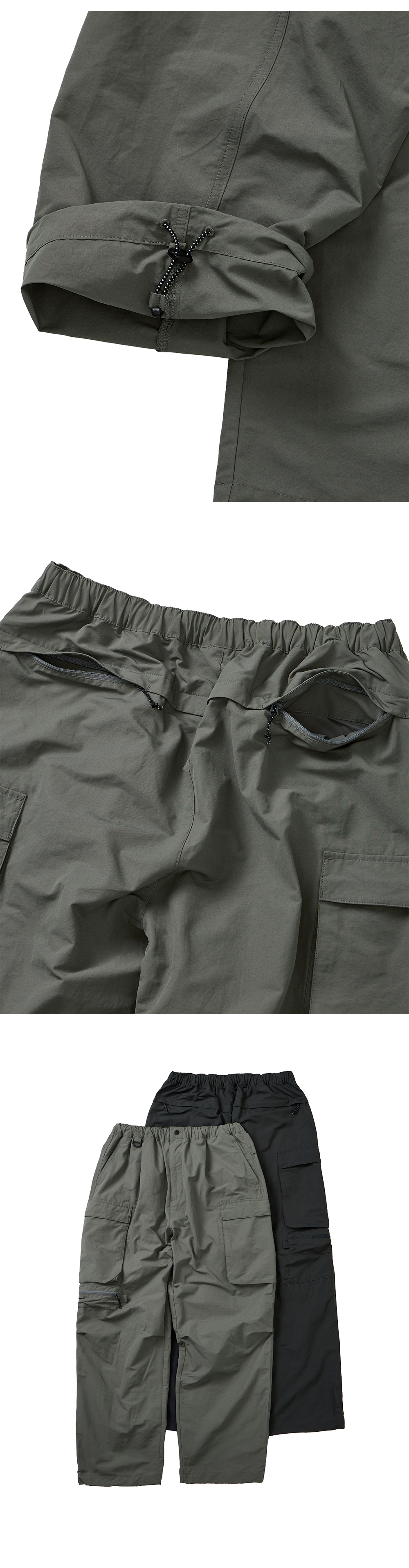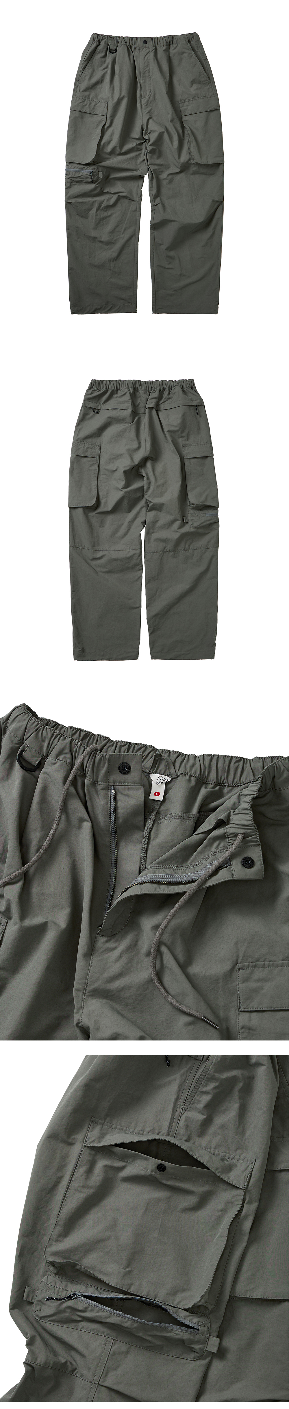 와이드 핏 실루엣과 입체적인 핀턱 디테일 양 사이드 버튼형 카고 포켓과 우측 지퍼 포켓, D링 디테일 벨트가 필요없는 밴드 형태에 끈이 있는 디자인 스트링 디자인의 폭 조절이 가능한 밑단으로 다양한 연출 가능 히든 지퍼형 뒤 포켓으로 소지품 이탈 방지와 깔끔한 착용