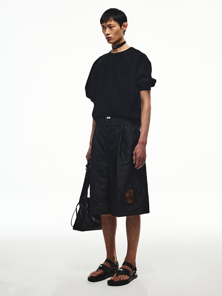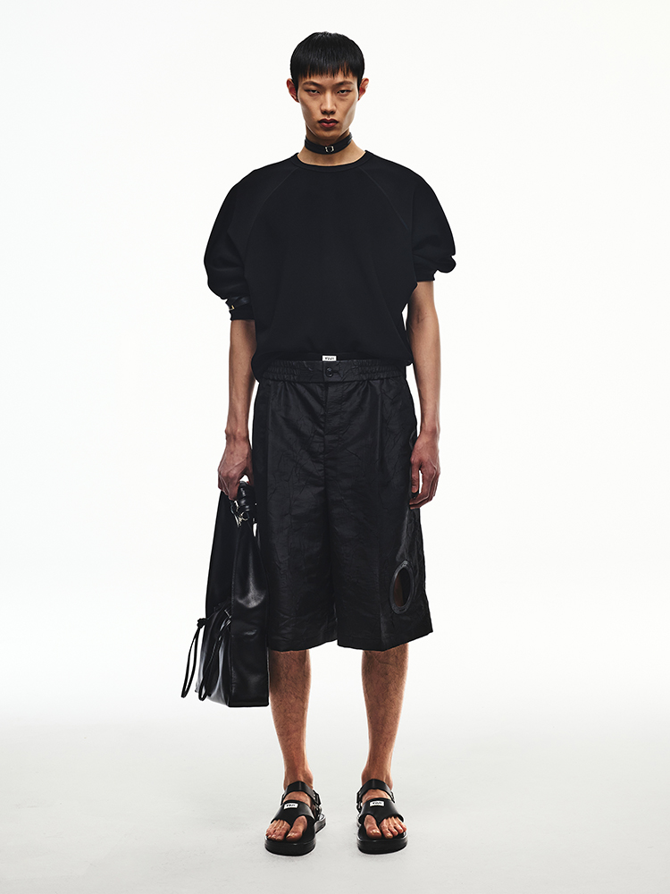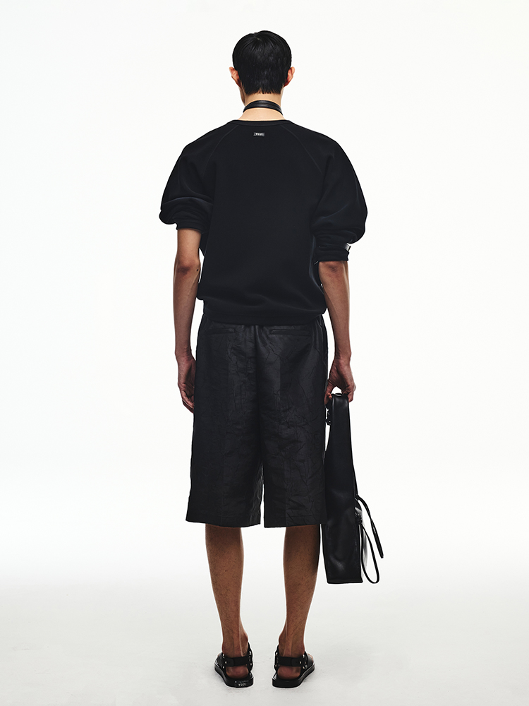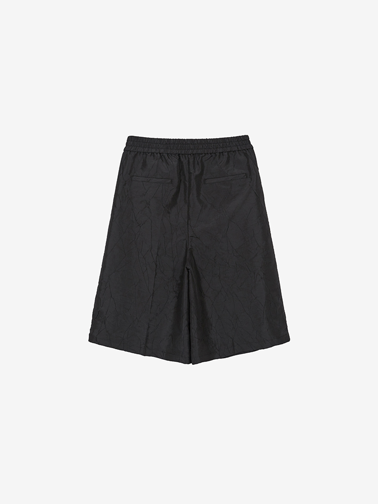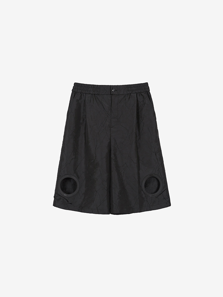 DESCRIPTION 크링클 효과가 있는 원단의 버뮤다의 기장의 팬츠입니다. 로고가 각인된 시그니처 고무링 라벨의 디테일 포인트로 유지만의 독창적인 유니크함이 돋보이는 버뮤다 팬츠입니다. 유니섹스 라인입니다. SIZE GUIDE S SIZE / 허리 72cm 힙 110cm 허벅지 77cm 앞밑위 38.4cm 뒷밑위 47.4cm 밑단 36.5cm 총기장 66cm M SIZE / 허리 76cm 힙 114cm 허벅지 78cm 앞밑위 39cm 뒷밑위 48cm 밑단 38.5cm 총기장 66.5cm L SIZE / 허리 80cm 힙 118cm 허벅지 79cm 앞밑위 39.6cm 뒷밑위 48.6cm 밑단 40.5cm 총기장 67cm 모델 착용 사이즈 : S SIZE DETAIL Fabric/Care NYLON 55% POLYESTER 45% Made in Korea