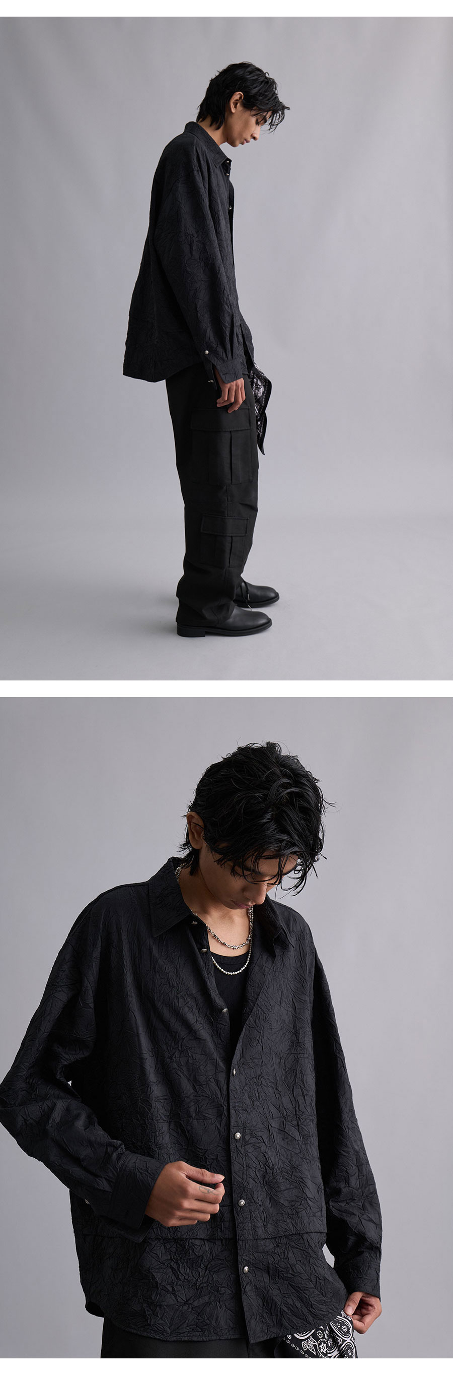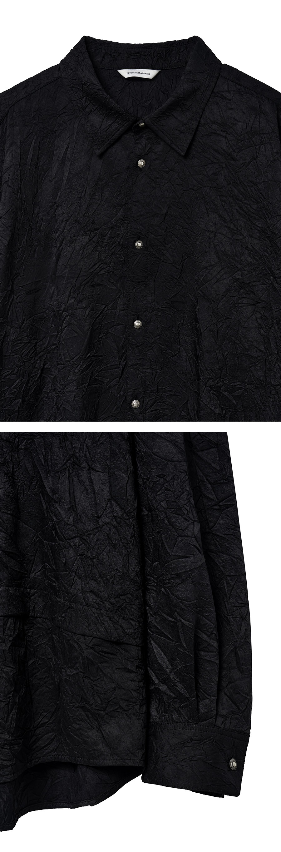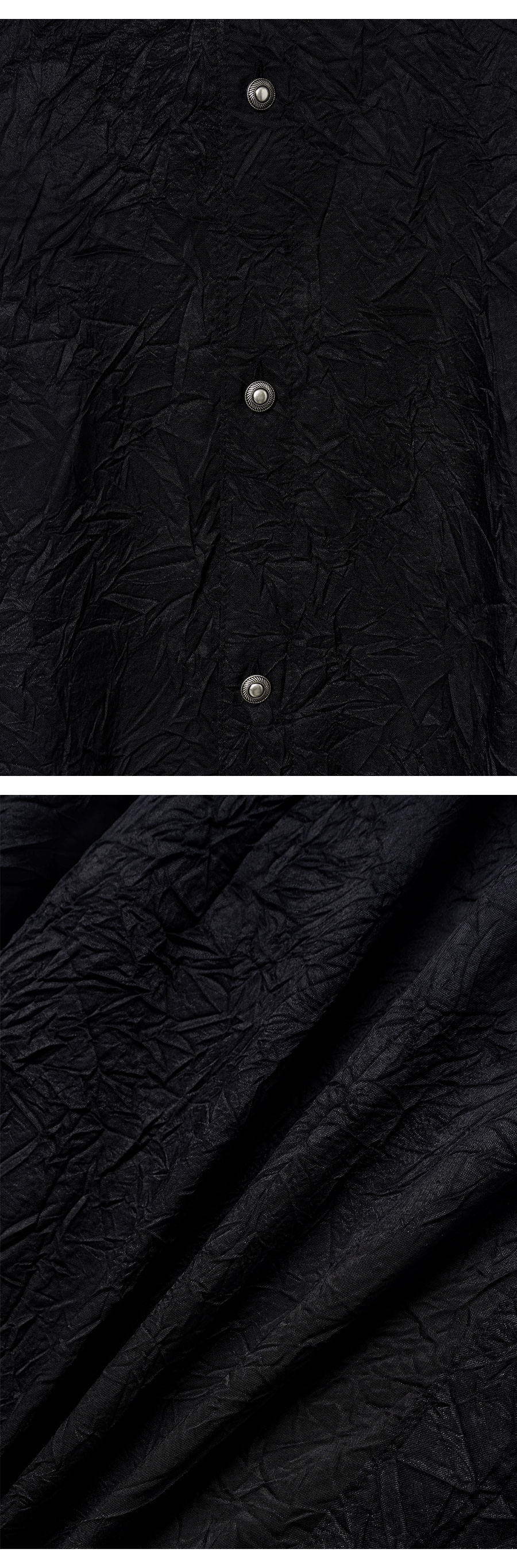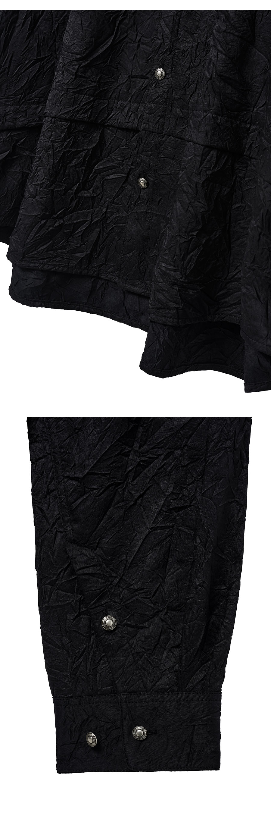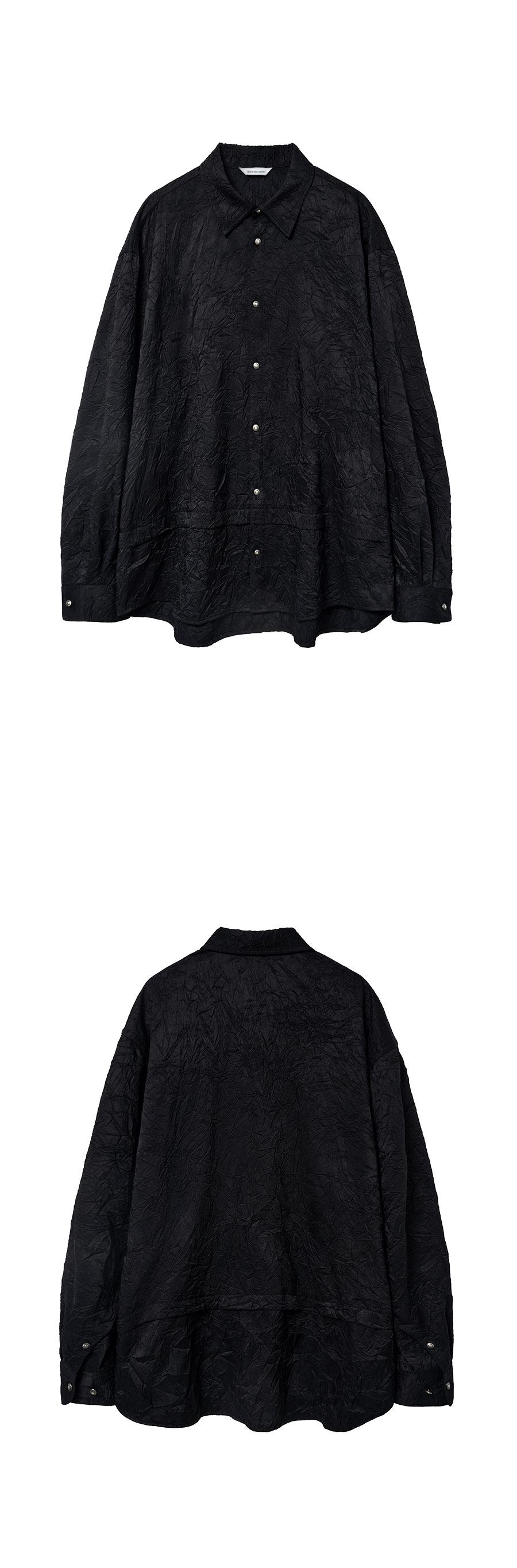 Material Outshell : Polyester 90% Polyamide 10% Colour : Black - 150g/sqm Wrinkle processing fabric - Silver varnished 11mm button - Curved seam sleeve line - Folded detail on the body - Collar double stitch detail - Relaxed fit