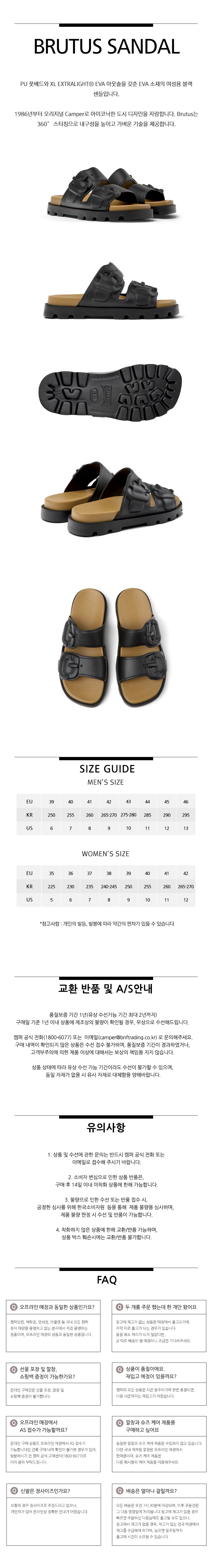 캠퍼 여성 브루투스 샌들 슬리퍼 블랙