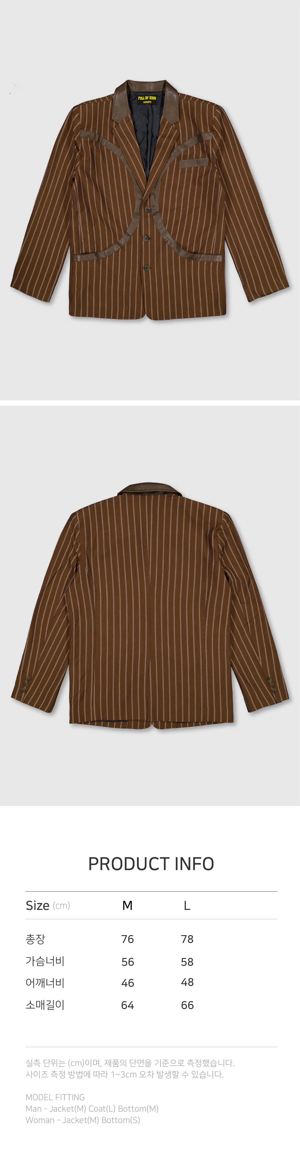 본 제품은 주문제작 제품으로 주문 후 5~7일 후 순차 발송됩니다 (주말, 공휴일 제외) - FULLOFSSUN의 시그니쳐 써클 디테일이 레더패치로 들어간 스트라이프 원단의 블레이져 입니다. - 25SS 시즌 컨셉영화인 "제5원소"의 주인공인 조그의 블레이져를 모티브로 제작한 블레이져입니다. - 써클디자인의 포켓