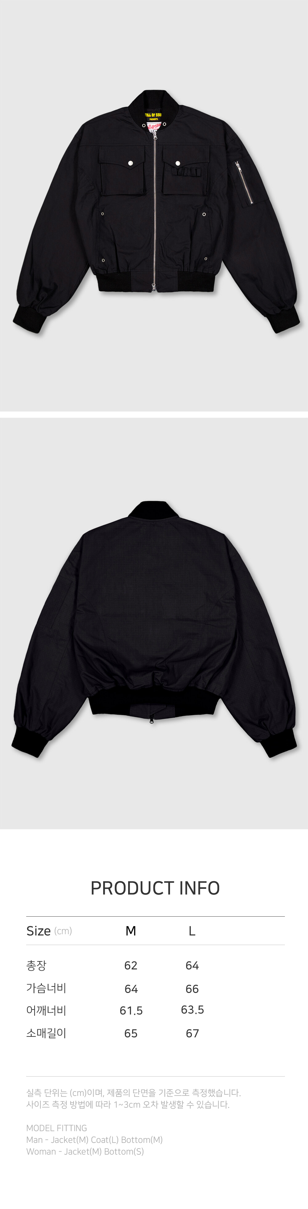 본 제품은 주문제작 제품으로 주문 후 5~7일 후 순차 발송됩니다 (주말, 공휴일 제외) - 립스탑 원단의 오버핏 실루엣의 크롭한 멀티포켓 봄버자켓입니다. - 25SS 시즌 컨셉영화인 "제5원소"의 주인공 코벤달라스의 자켓을 모티브로 제작한 자켓입니다. - 멀티포켓 디테일 - YKK사의 투웨이 지퍼 및 스냅 단추 부자재