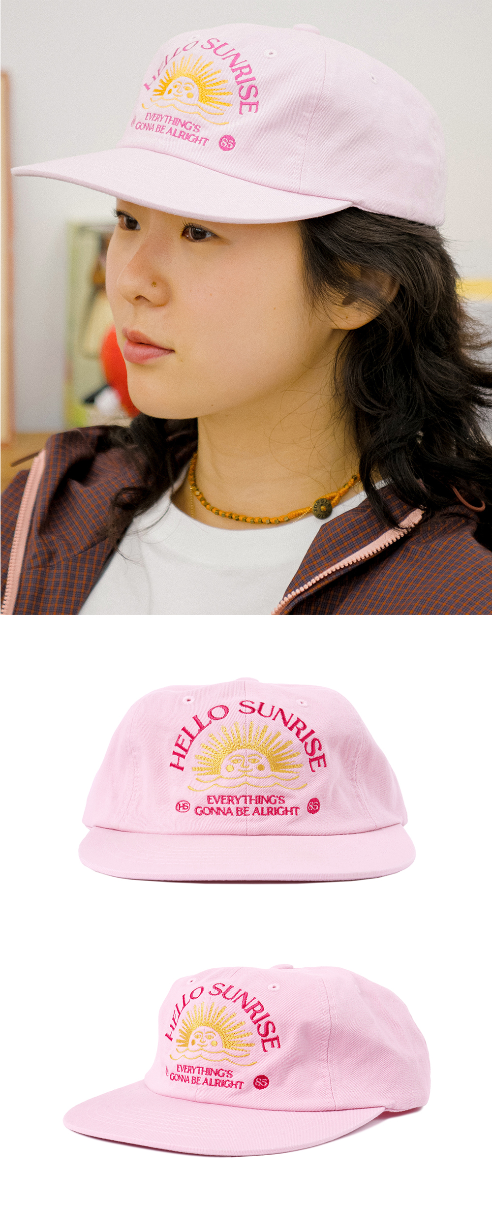 헬로선라이즈 워싱 투톤 아치 로고 6패널 캡 핑크