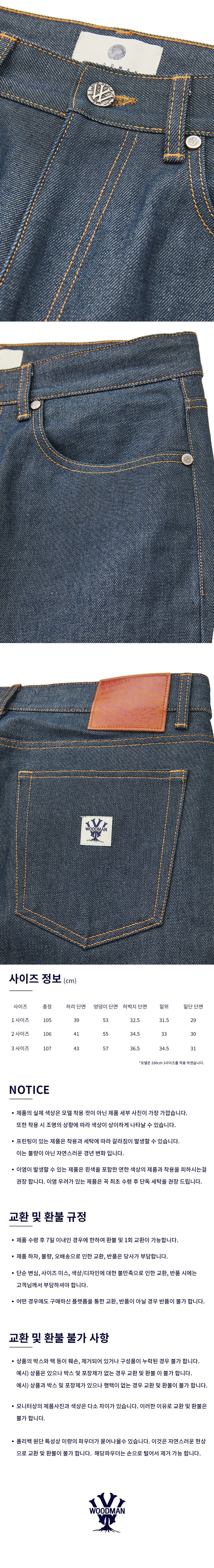 전통적인 생지 원단을 사용하여 트렌디함을 데님으로 재해석한 데님 입니다. 오리지날 원단의 느낌을 위해 해외 수입 원단을 사용하였습니다. 또한 트렌디한 와이드핏으로 기존 생지 데님보다 다양하게 착용 가능 합니다. * 해당 데님은 ‘생지’ 원단 입니다. 꼭 이염에 주의하시기 바랍니다. * 세탁은 꼭 단품으로 하시는걸 권장 드립니다. - 트렌디하고 유니크한 와이드핏 생지 데님 - YKK 지퍼 - 우드먼 시그니처 ‘W’ 켄톤 - 우드먼 시그니처 나이태 리벳 - 바지 밑단을 걷으면 보이는 포인트 스티치