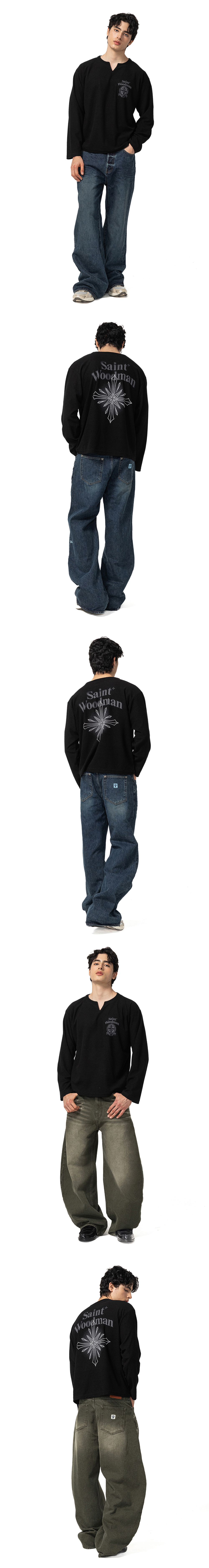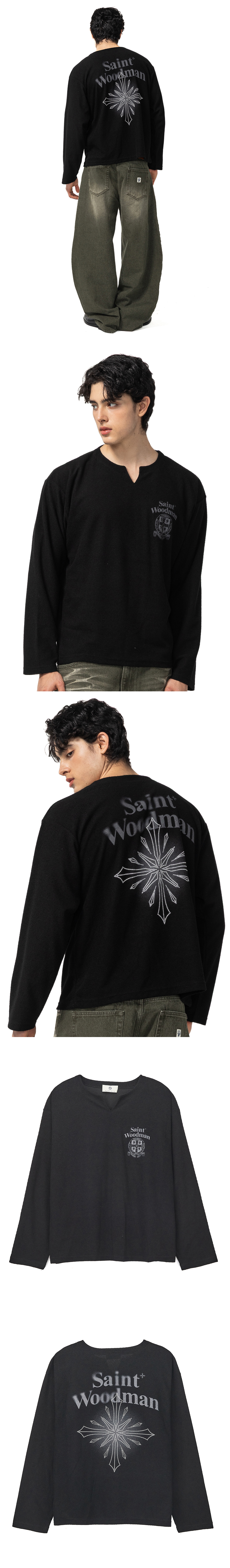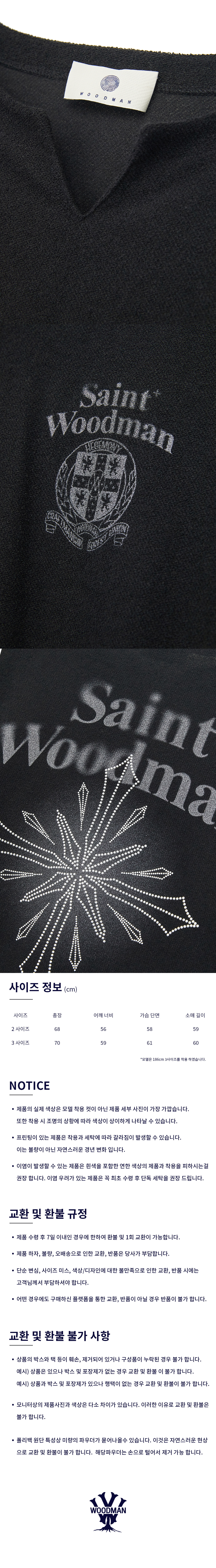 가볍게 착용 가능한 유니크한 디자인의 롱 슬리브 입니다. 독특한 느낌의 텍스처 원단이 인상적이며 새로운 실루엣으로 디자인 되었습니다. 전면 가슴과 후면 등 부분에 세인트 우드먼 블러 그래픽이 디자인 되었으며 후광을 후광을 이미지한 무광 큐빅 디자인으로 마무리 되었습니다. - 무광 큐빅 헤일로 디자인 - 독특한 텍스처의 원단 - 유니크한 목 절개 디자인