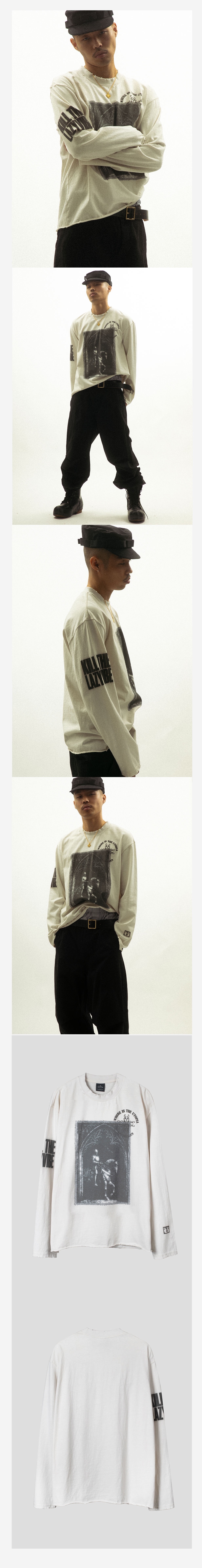 Fabric C 100% Made In Korea Model Spec. 178cm / 64kg 1 size 거친 느낌의 14수 원단 몸판, 소매에 들어가는 빈티지한 프린트 DTP 포인트라벨 디테일 로우엣지 처리 * 반드시 낮은 온도의 단독 물세탁 후 자연 건조를 권장합니다.