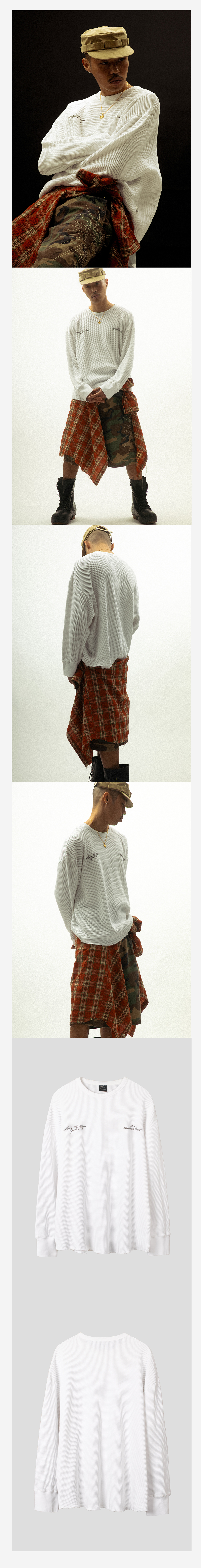 Fabric Cotton 100% Made In Korea Model Spec. 178cm / 64kg 2 size 신축성 있는 와플형태의 원단 셔츠 형태의 밑단 마무리 빈티지함을 강조하는 로우엣지커팅 목 부분 바인딩 디테일 * 반드시 낮은 온도의 단독 물세탁 후 자연 건조를 권장합니다.