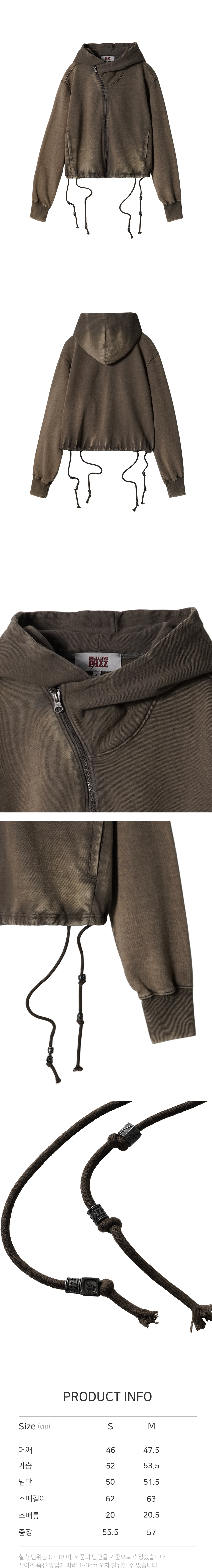 커브드 형태의 지퍼와 피그먼트 워싱이 포인트인 레귤러 핏의 크롭 후드집업 지퍼 풀러에 스친 옅은 마모감은 워싱 과정 속에서 자연스럽게 완성된 디테일로, 빈티지한 무드를 섬세하게 드러냅니다. FEATURE - 레귤러핏의 크롭 후드집업 - 커브트 형태 지퍼 디테일 - 비대칭 디테일 앞 여밈 - 밑단 스트링 - 커스텀 스트링 참 디테일