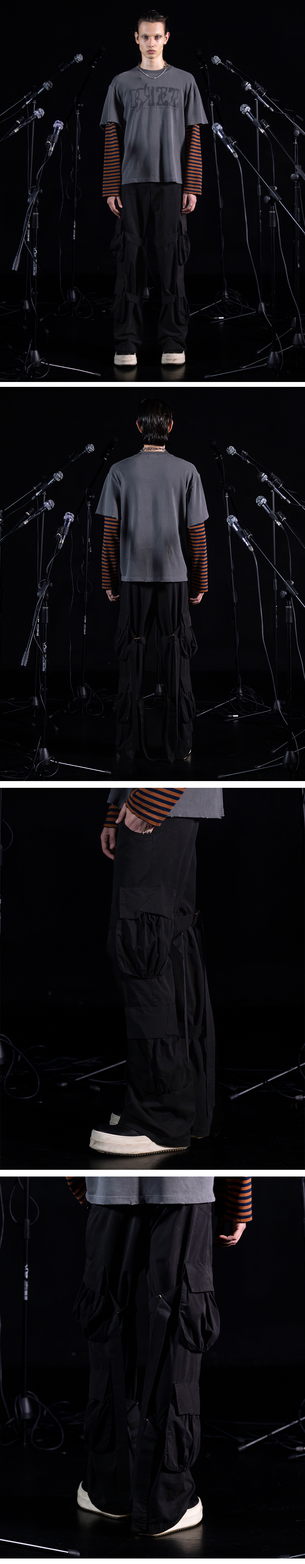 볼륨감 있는 아웃포켓과 언밸런스 플랩 디테일이 돋보이는 세미와이드 핏 카고팬츠 FEATURE - 세미 와이드핏 실루엣 - 아웃포켓 - 허리 라인 스트랩 디테일 - 몸판 스트랩으로 사이즈 조절 가능 - 빈티지한 컬러감 - 멜로우 리즈 각인 단추
