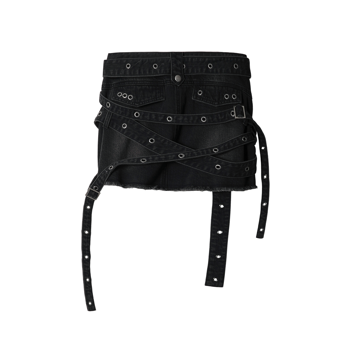 벨트가 레이어드된 데님 미니스커트 세 종류의 벨트가 포함되어 있어 스타일에 따라 다양하게 연출 가능하며, 다른 아이템과 믹스매치할 수 있는 활용도 높은 디자인입니다. FEATURE - 마이크로 기장 미니 스커트 - 벨트 레이어드 디테일 - 탈부착 가능한 벨트 - 멀티 스타일링 활용도 - 스트랩 형식 벨트 고리 - 멜로우 개발 부자재 사용