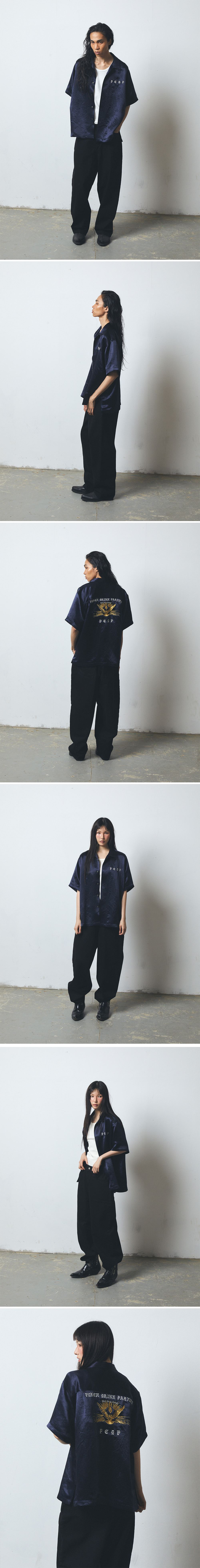 광택감 있는 네이비 원단과 구조적인 실루엣이 특징인 오픈 카라 셔츠입니다. 전면에는 간결한 PCDP 자수, 후면에는 2도 자수로 표현된 Dovey Dovey 그래픽이 Gold 자수와 광감이 강하고 짙은 Navy 컬러의 콤비네이션으로 표현됩니다. 짧은 소매와 넉넉한 핏으로 편안한 착용감을 제공합니다. 두께감 있는 원단이 형태감을 유지하면서도, 어깨 라인이 자연스럽게 떨어지는 드롭 숄더로 밸런스가 좋은 세련된 실루엣으로 완성됩니다. Size Guide Male / 180cm, 55kg, Size 2 Female / 174cm, 54kg, Size 2
