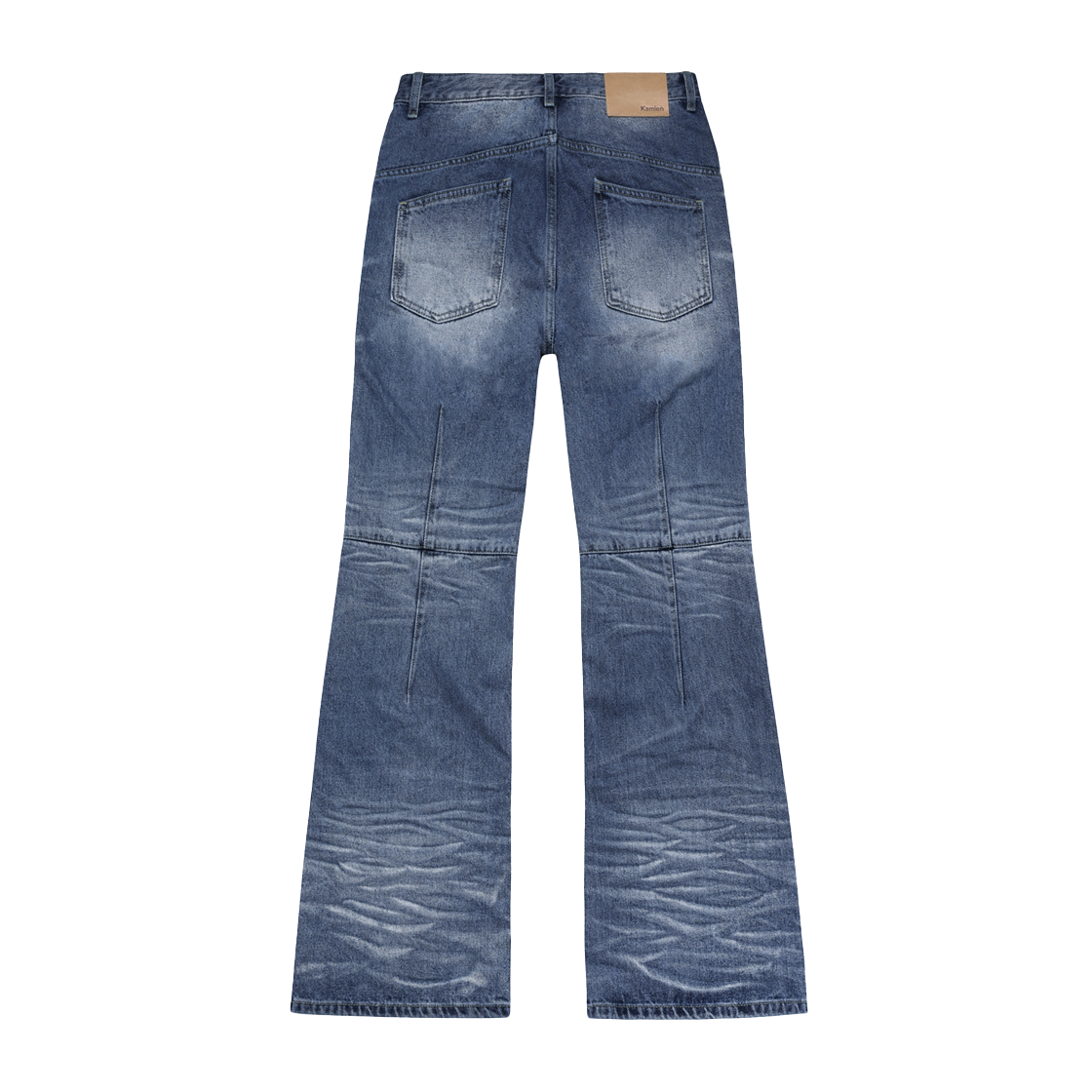 절개 디테일과 플레어 실루엣이 특징인 크로스 다트 데님 팬츠. 무릎 뒤 절개와 다트가 만드는 X자 라인이 백 포인트 역할을 하며, 여유 있는 밑단으로 자연스러운 플레어핏을 연출합니다.