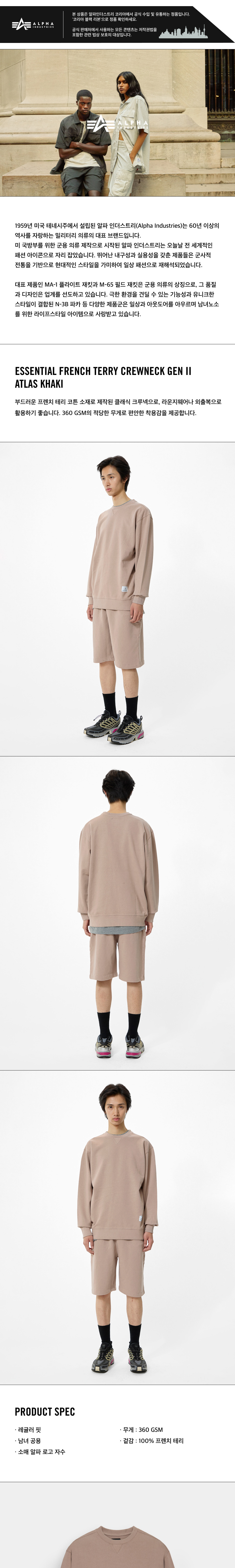 알파 인더스트리 에센셜 프렌치 테리 크루넥 Gen II 아틀라스 카키