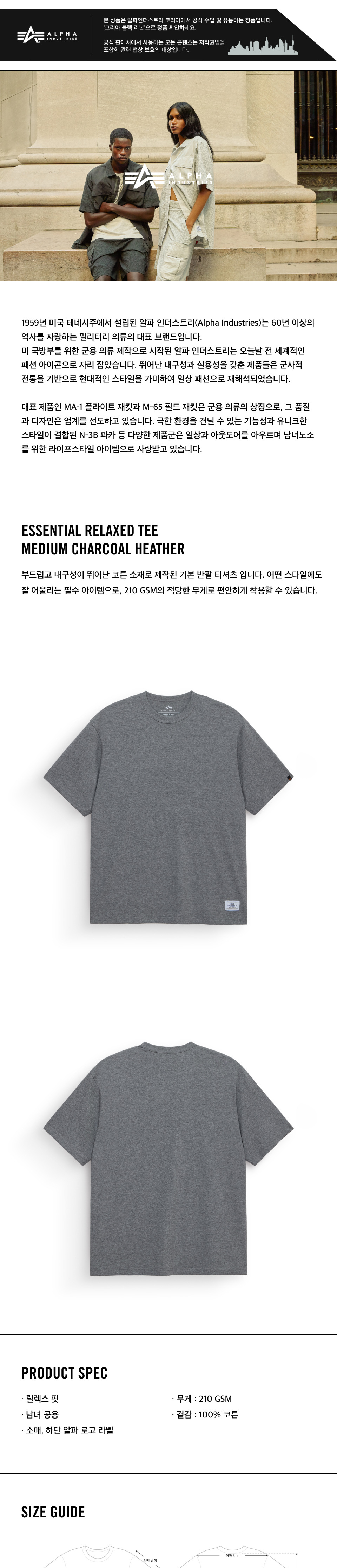 알파 인더스트리 에센셜 릴랙스드 티셔츠 미디엄 차콜 헤더