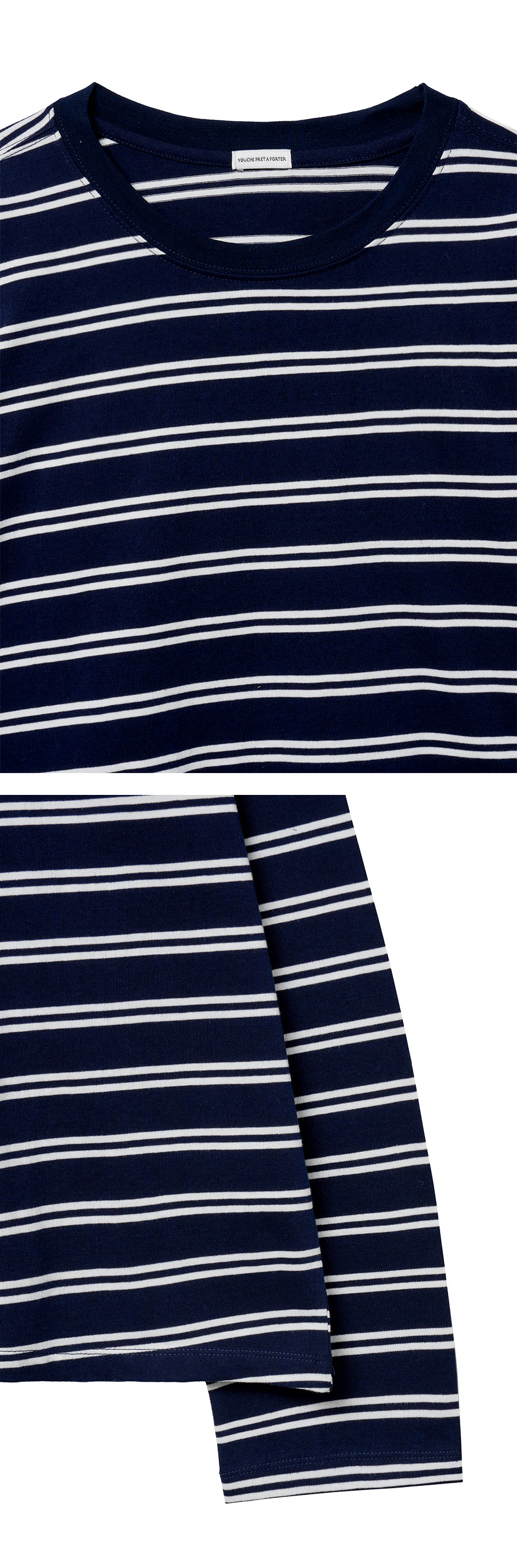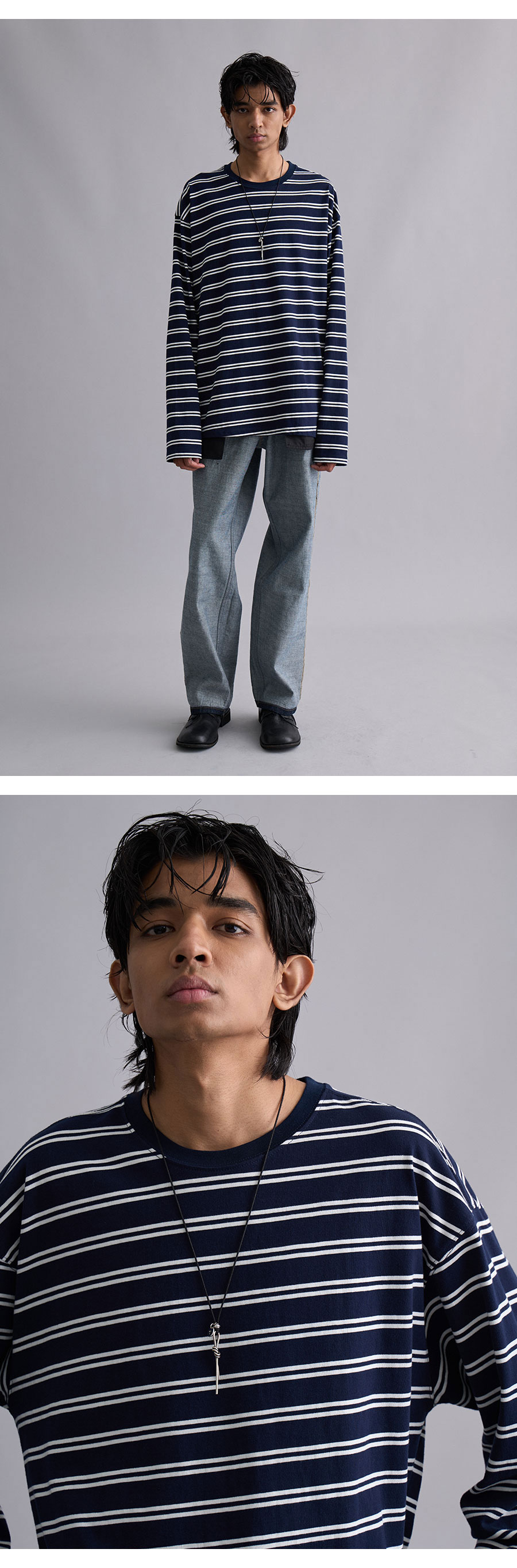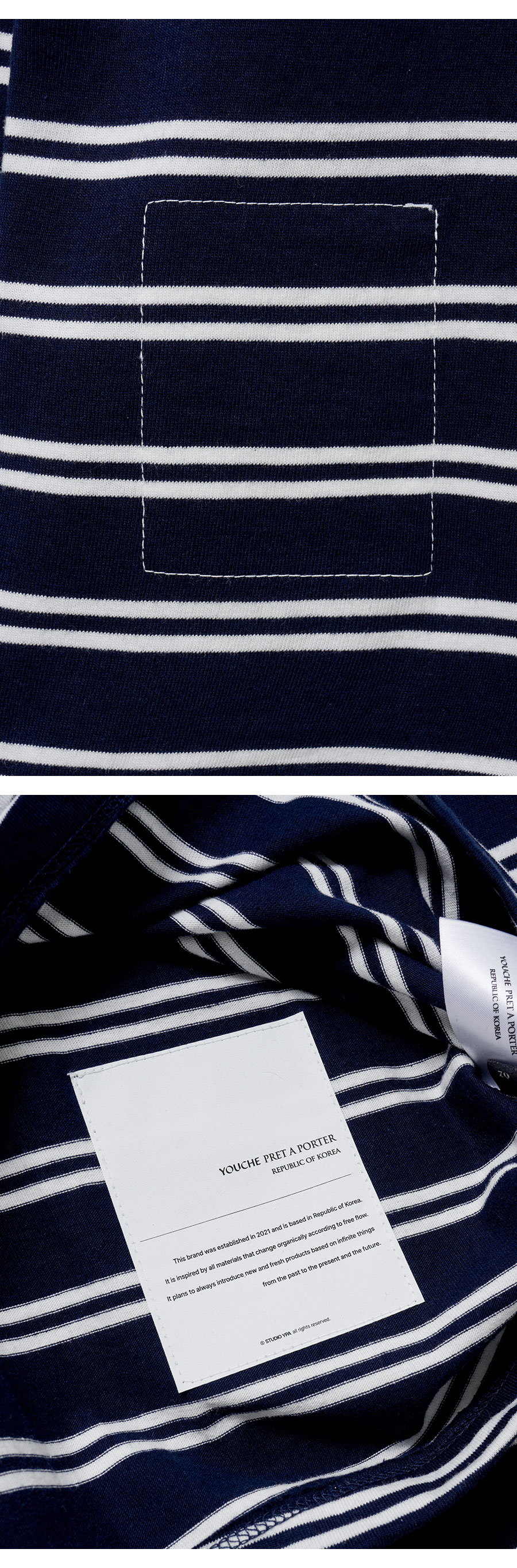 Material Outshell : Cotton 100% (320g/sqm 20S Single yarn dyed jersey fabric) Colour : Navy - 320g/sqm 20s Single yarn dyed striped jersey - Tenta & Dumble & Bio processing - 1x1 Span rib - Oblique striped detail on the body - Youche signature label inside - Relaxed fit