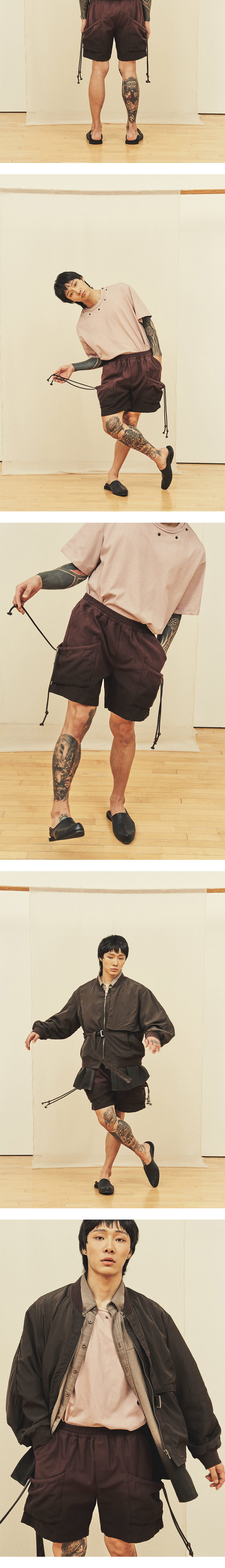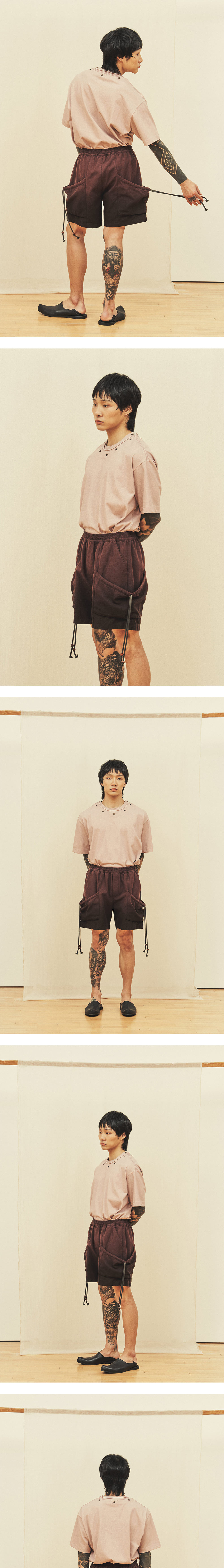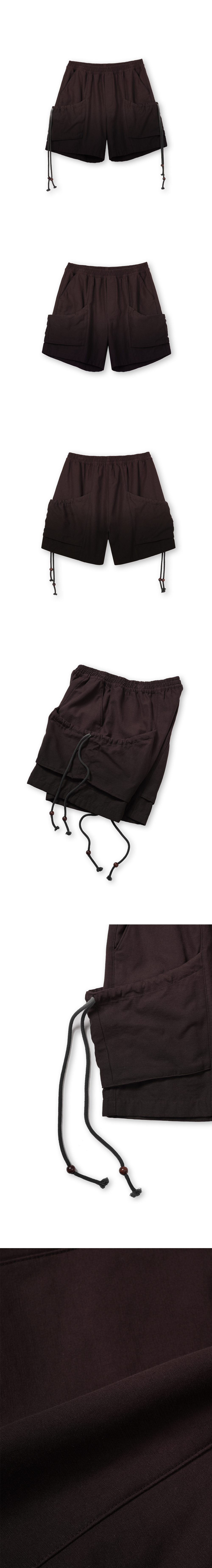 [원단] 볼륨감이 느껴지는 저밀도 100% 코튼 원단을 사용해 자연스러운 슬럽 텍스처가 돋보입니다. 워싱 가공되어 소프트한 감촉과 컬러가 특장점입니다. 여름철 잦은 세탁에도 견고함을 유지하는 튼튼한 원단입니다. [디테일] 짧고 풍성한 실루엣으로 디자인되었으며, 볼륨감 있는 소재에 어울리는 큼직한 포켓을 배치했습니다. 스트링을 추가해 셔링을 강조할 수 있도록 했으며, 트위스트 무늬 스트링을 사용해 극적인 다잉 효과를 더했습니다. 또한, 올 풀림을 방지하는 종 모양의 나무 팁을 더해 동양적인 감성을 담았습니다. [메이킹] 브라운과 차콜 컬러 염료를 사용해 그라데이션 다잉을 완성했습니다. 각 개체별로 일일이 염료에 담그는 전통적이면서 고난도의 다잉 기법을 활용해 수묵화 같은 자연스러운 농도 차이를 구현했습니다. * 모델 : 180cm 70kg / III (L) 착용