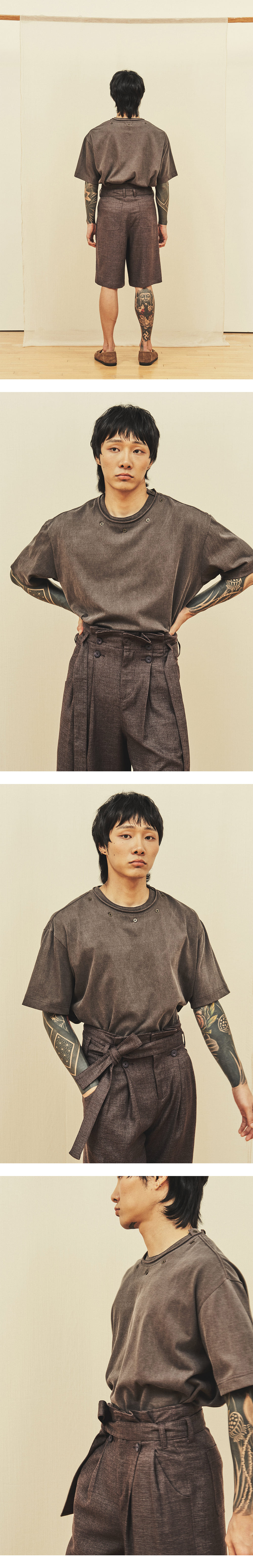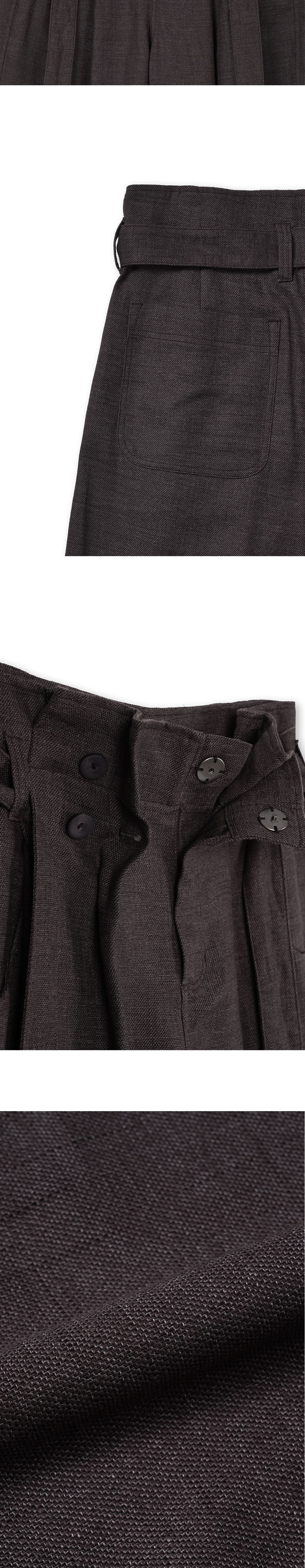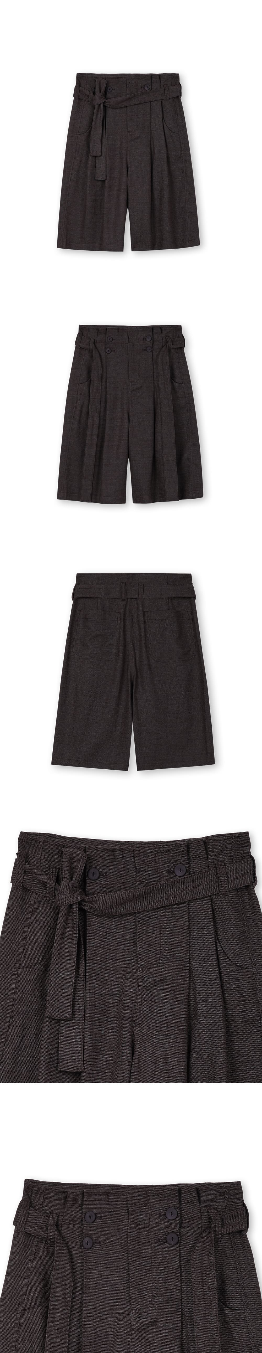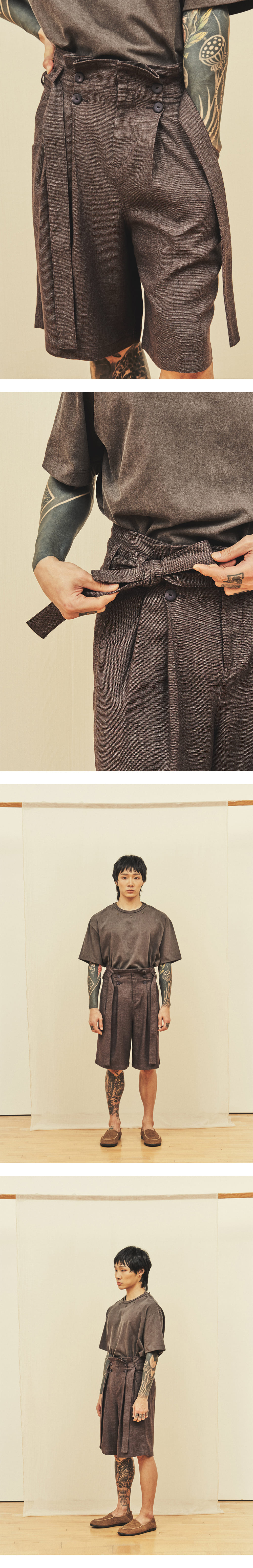 [원단] 트위드 조직감이 돋보이는 린넨·코튼 혼방 소재를 사용했습니다. 굵고 러프하게 짜인 텍스처 덕분에 구김에 강하며 시원한 착용감을 제공합니다. 멜란지 컬러 특유의 깊이 있는 색감이 특징입니다. [디테일] 허리 부분에 셔링 디테일을 더해 볼륨감을 살렸으며, 동일한 소재의 벨트로 실루엣을 조절할 수 있습니다. 풍성한 셔링과 버뮤다 팬츠 특유의 기장감이 조화를 이루며 유니크한 실루엣을 연출합니다. 벨트는 탈부착이 가능해 다양한 스타일링이 가능합니다. 하이 웨이스트 디자인과 전면부의 큼직한 네 개의 단추가 포인트입니다. [메이킹] 전면부 단추는 소뿔 소재에 스웨이드 질감 처리를 더한 후 재염색해 고유의 컬러와 촉감을 완성했습니다. * 모델 : 180cm 70kg / II (30) 착용