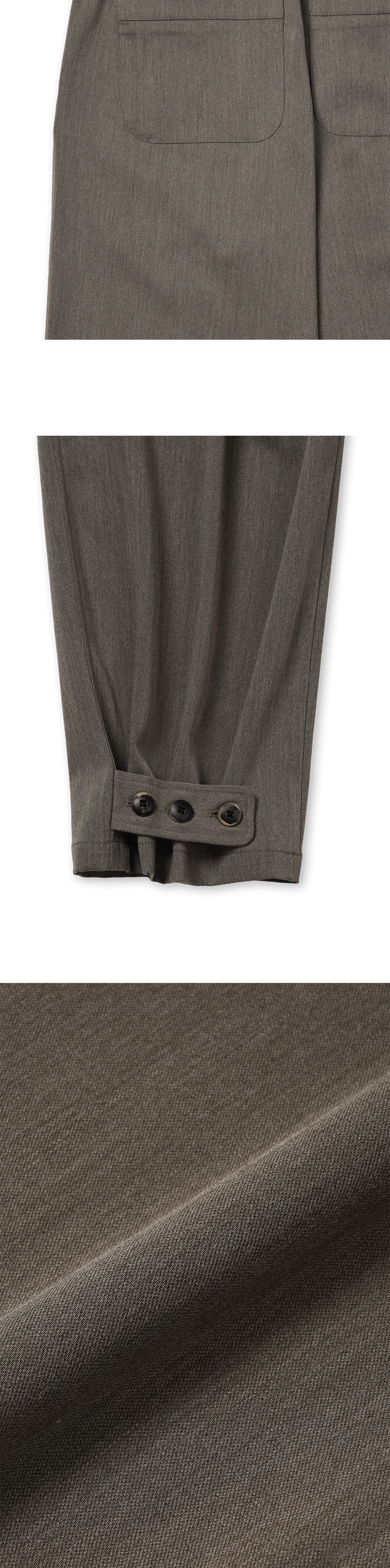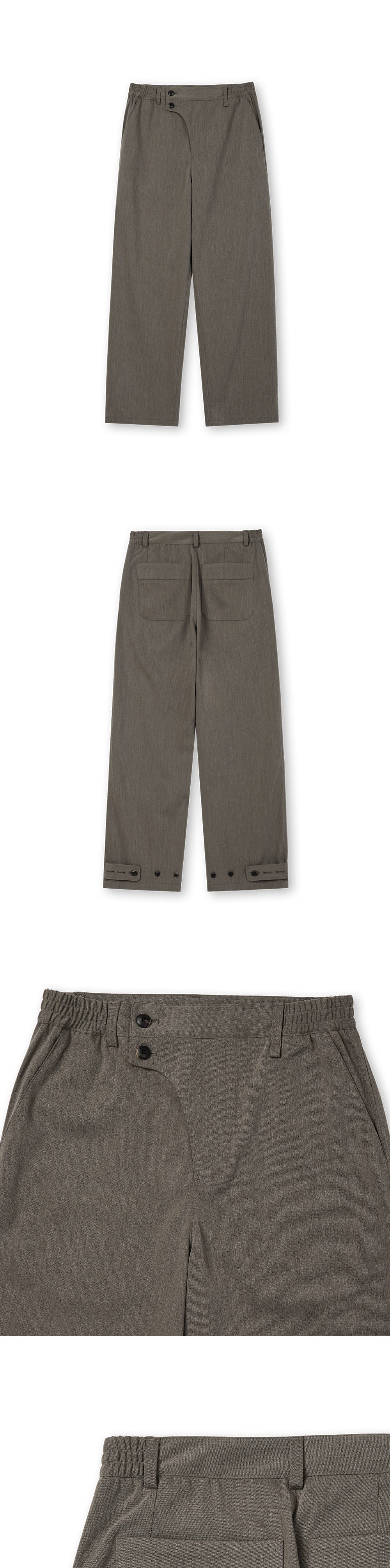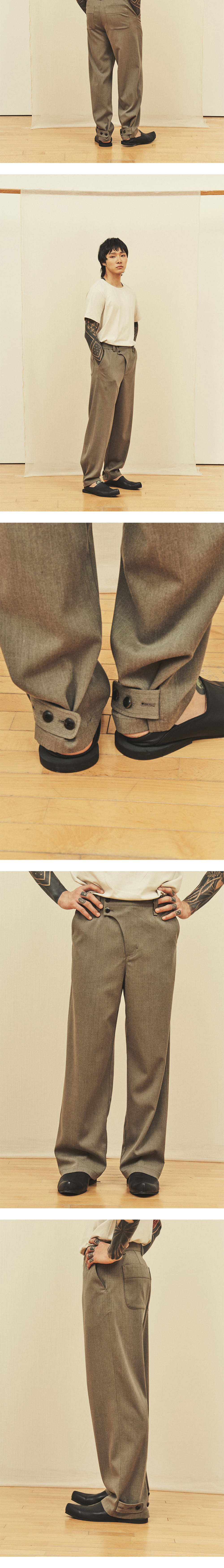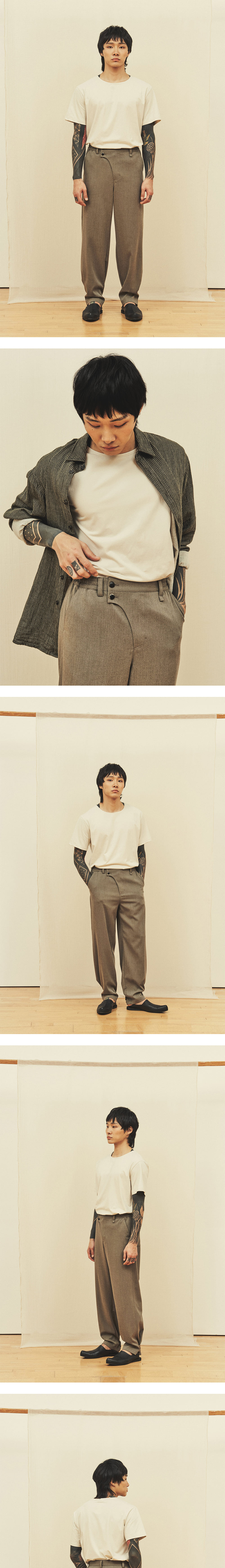 [원단] 사계절 착용 가능한 적당한 두께감의 원단입니다. 구김에 강하고 신축성이 좋아 편안합니다. [디테일] 지난 시즌 베스트 셀러였던 'Curved Line Pants'를 디벨롭하여 제작했습니다. 세미 와이드 핏으로 스타일링 활용도가 높습니다. 플라이 부분을 곡선 형태로 디자인하고 큼지막한 소뿔 단추 2개를 사용해 동양적인 무드를 더했습니다. 밑단에는 3개의 단추가 있어 핏 조절이 가능하도록 설계했습니다. [메이킹] 기존 고리 방식에서 업그레이드하여, 밑단 단추를 더욱 단단하게 체결할 수 있도록 비죠 형태로 디벨롭했습니다. 도톰하고 둥근 모양의 소뿔 버닝 단추를 사용해 고급스러움을 강조했으며, 사이드 밴딩을 적용해 더욱 편안한 착용감을 제공합니다. *사진 상의 키링은 세트 상품이 아닙니다. * 모델 : 180cm 70kg / III (32) 착용