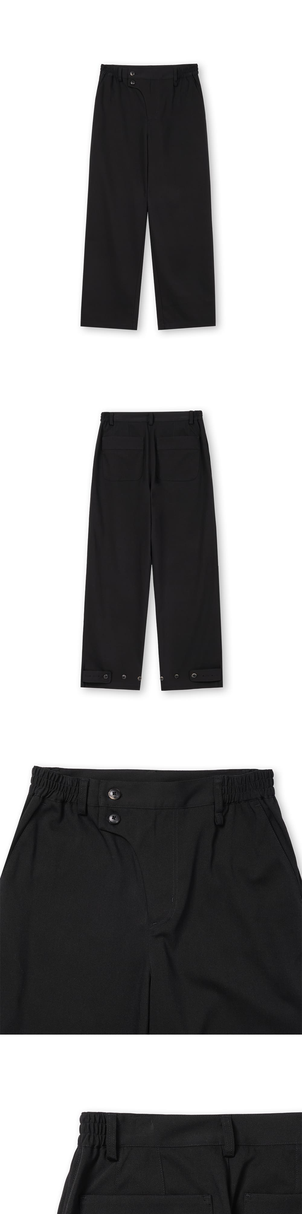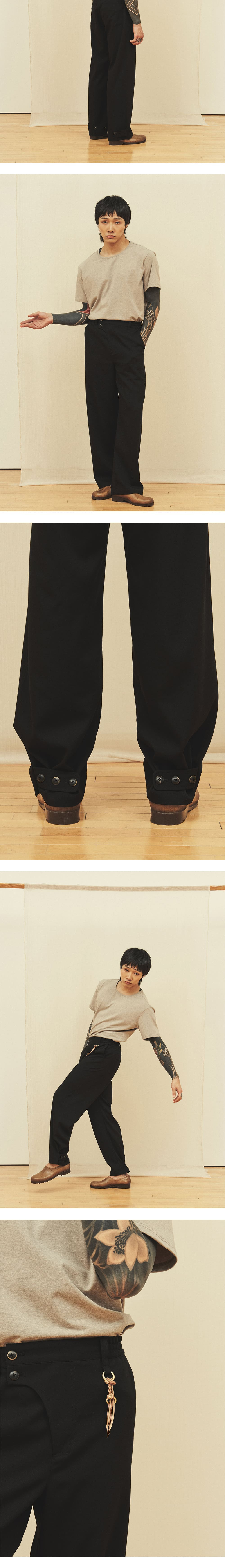 [원단] 사계절 착용 가능한 적당한 두께감의 원단입니다. 구김에 강하고 신축성이 좋아 편안합니다. [디테일] 지난 시즌 베스트 셀러였던 'Curved Line Pants'를 디벨롭하여 제작했습니다. 세미 와이드 핏으로 스타일링 활용도가 높습니다. 플라이 부분을 곡선 형태로 디자인하고 큼지막한 소뿔 단추 2개를 사용해 동양적인 무드를 더했습니다. 밑단에는 3개의 단추가 있어 핏 조절이 가능하도록 설계했습니다. [메이킹] 기존 고리 방식에서 업그레이드하여, 밑단 단추를 더욱 단단하게 체결할 수 있도록 비죠 형태로 디벨롭했습니다. 도톰하고 둥근 모양의 소뿔 버닝 단추를 사용해 고급스러움을 강조했으며, 사이드 밴딩을 적용해 더욱 편안한 착용감을 제공합니다. *사진 상의 키링은 세트 상품이 아닙니다. * 모델 : 180cm 70kg / III (32) 착용