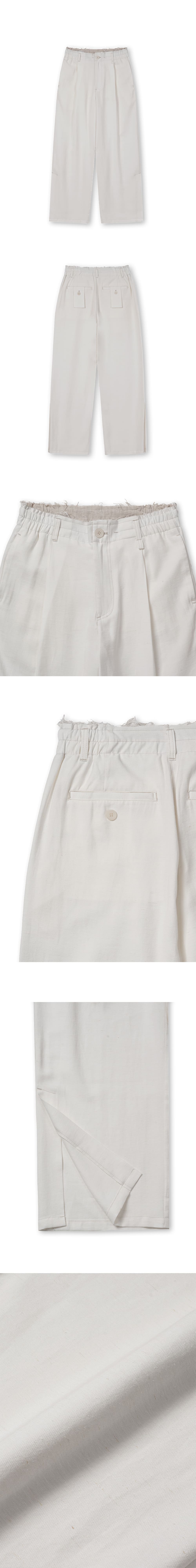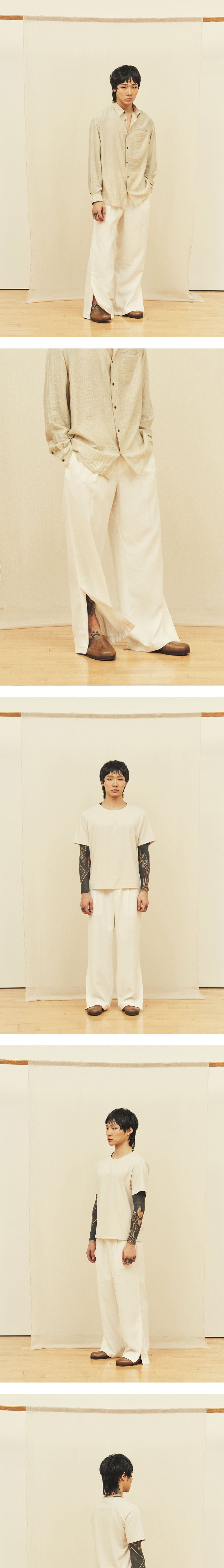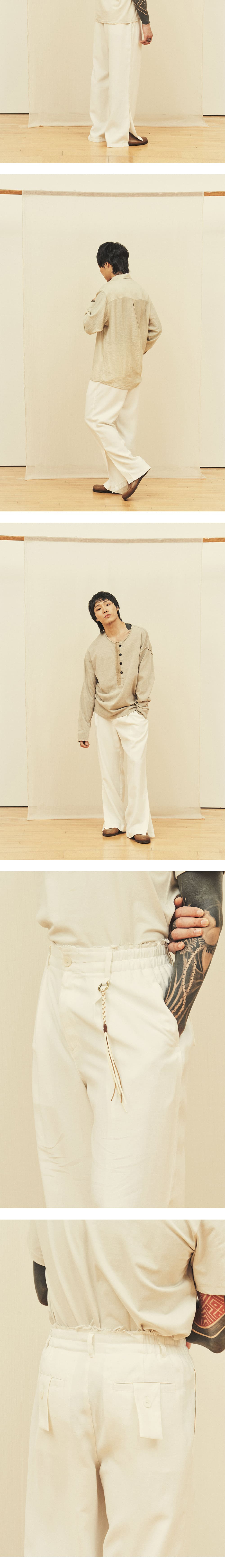 [원단] 더운 계절에도 쾌적하게 착용할 수 있도록 린넨 혼방 원단을 사용했습니다. 자연스럽게 흐르는 실루엣과 은은한 광택감이 특징이며, 구김이 적어 깔끔한 핏을 유지할 수 있습니다. 또한, 린넨 특유의 감촉과 텍스처가 고급스러움을 더해줍니다. [디테일] 흐르는 성질이 강한 원단의 특성을 살려 와이드한 실루엣으로 디자인했습니다. 밑단에 슬릿 디테일을 추가해 걸을 때마다 자연스럽고 유려한 움직임을 연출하며, 상황에 따라 밑단이 벌어지면서 플레어 핏이 돋보입니다. 뒷 주머니에는 긴 형태의 패치 디테일을 더해 위트 있는 포인트를 주었습니다. [메이킹] 허리 안쪽에는 배색 원단을 컷오프 마감하여 올이 자연스럽게 풀리도록 했으며, 사이드 밴딩을 적용해 편안한 착용감을 제공합니다. *사진 상의 키링은 세트 상품이 아닙니다. * 모델 : 180cm 70kg / III (32) 착용