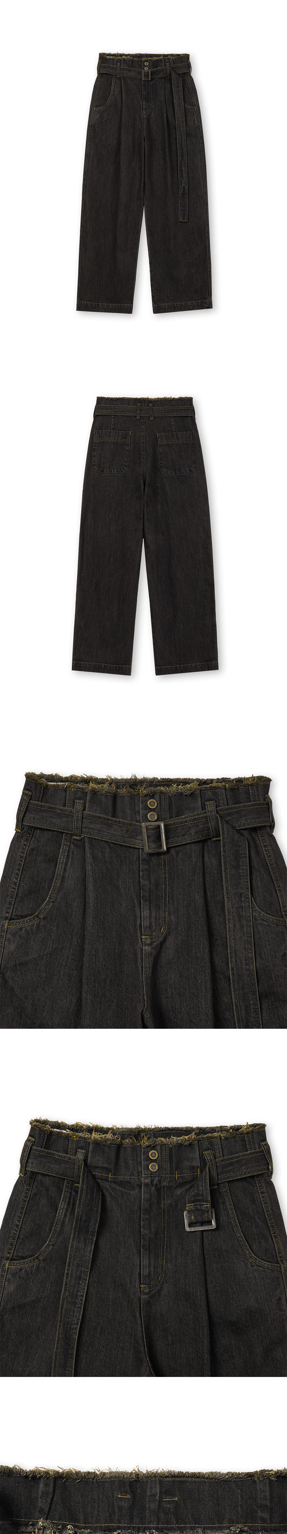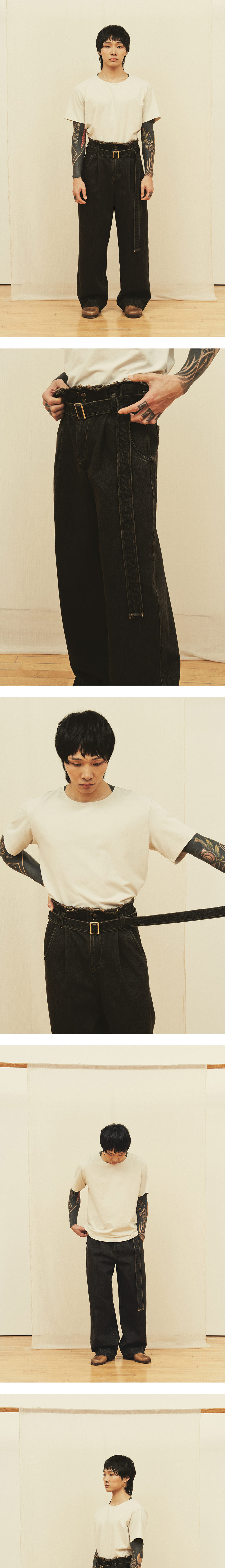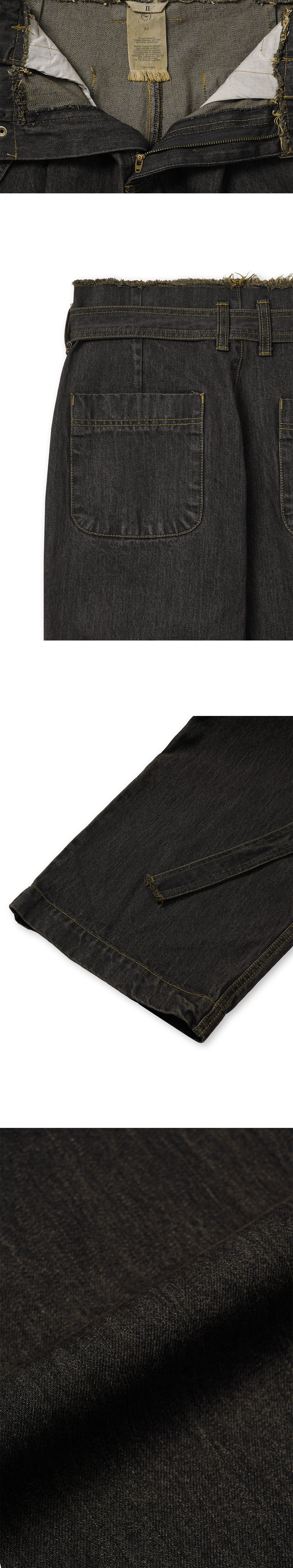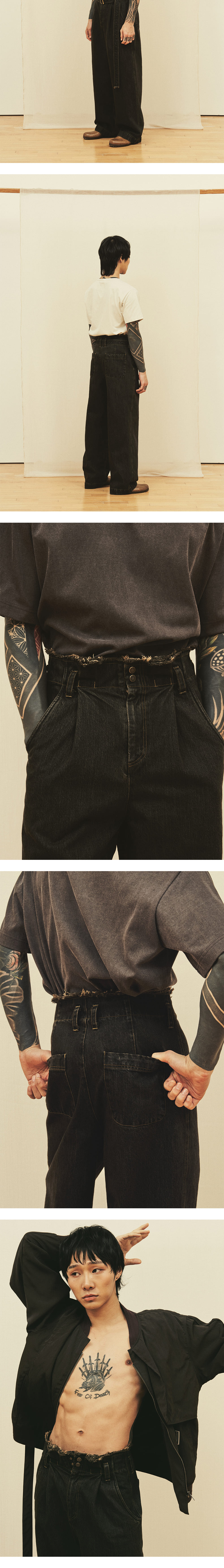 [원단] 13 온스의 사계절용 데님 원단을 사용했습니다. 빈티지한 블랙 컬러에 베이지 톤이 자연스럽게 어우러져 나아나나만의 고급스러운 무드를 연출합니다. [디테일] 허리 셔링과 와이드 핏이 서로 조화를 이루어 유니크한 실루엣을 연출합니다. 일반적인 데님과 차별화된 포켓 디자인을 적용했으며, 허리 부분은 셔링 디테일과 함께 컷 오프 마감 처리해 내추럴한 무드를 강조했습니다. 탈부착 가능한 같은 소재의 벨트로 다양하게 스타일링할 수 있습니다. [메이킹] 빈티지한 무드에 맞춰 앤티크한 골드 컬러의 버클과 스냅을 사용했습니다. * 모델 : 180cm 70kg / III (32) 착용