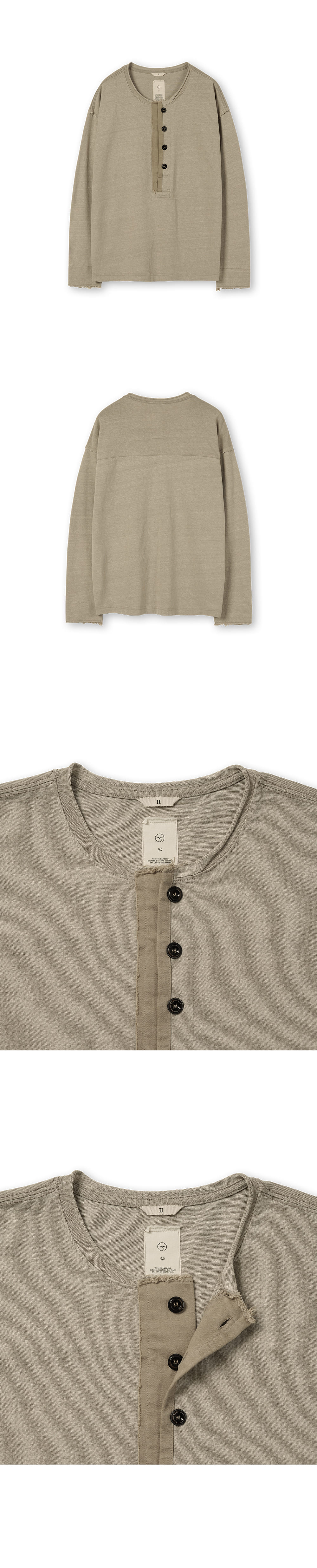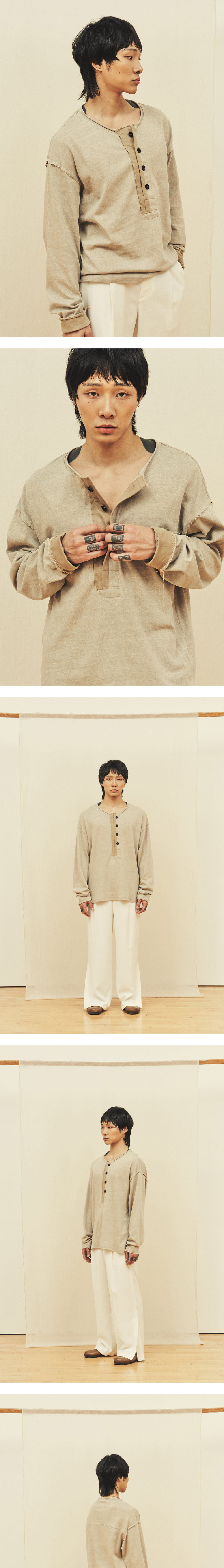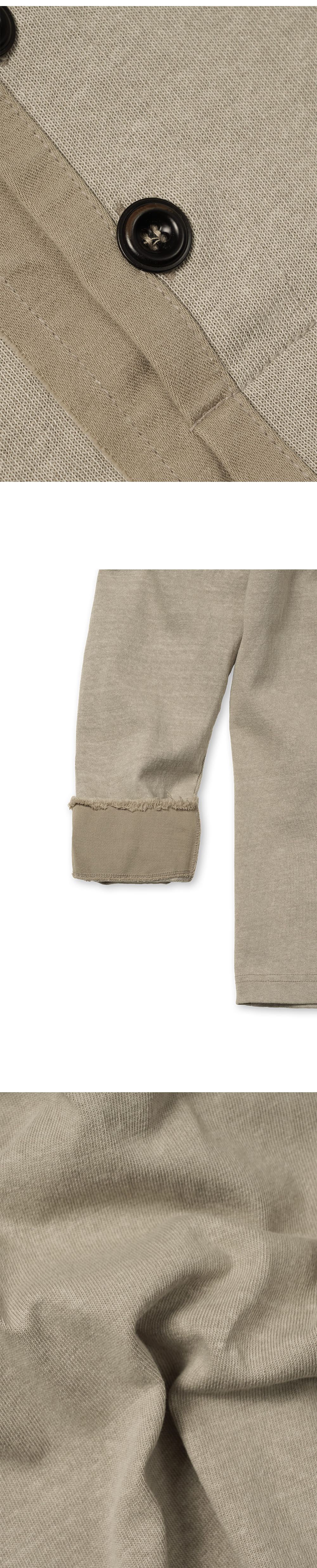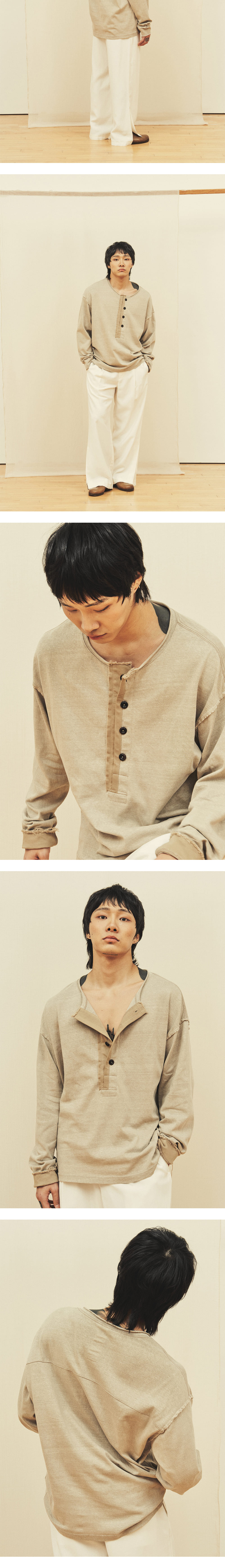 [원단] 100% 오가닉 코튼으로 제작되어 부드러운 감촉을 제공합니다. 피그먼트 염색을 통해 자연스럽고 깊이 있는 컬러감을 완성했습니다. [디테일] 깊게 파인 넥 라인과 컷 오프 마감으로 헨리넥 특유의 러프한 무드를 강조했습니다. 가슴 여밈 부분과 소매 안쪽에는 서로 다른 질감과 컬러의 원단을 사용해 감각적인 대비를 연출했습니다. 단추를 풀거나 소매를 걷어 스타일링에 포인트를 더할 수 있습니다. [메이킹] 여밈 부분 아래에는 보강 테이프를 덧대어 견고함을 높였습니다. 너트 단추는 염색 후 이염 방지 코팅을 더해 내구성을 강화했습니다. 원 워싱 처리로 잦은 착용과 세탁에도 형태가 유지됩니다. * 모델 : 180cm 70kg / III (L) 착용